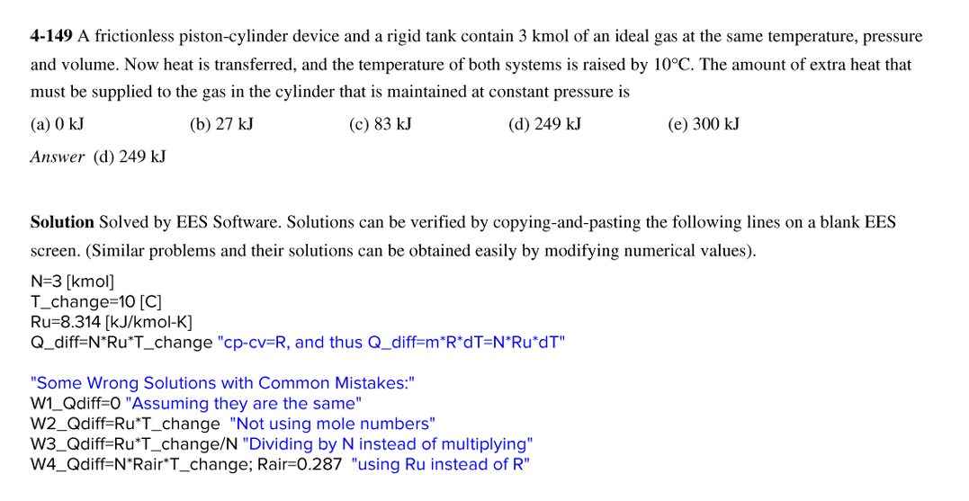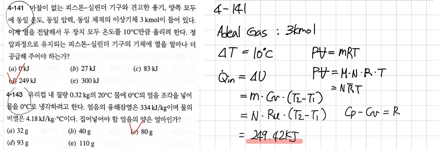 #열전달#열역학#이상기체 상태방정식#정압과정 141번 문제에서 정압과정으로 유지되는 피스톤 실린더 기구에 3kmol 이상기체가 들어있는데 열을 얼마나 공금해줘야 10도씨가 올라가냐는 문제였는데, 평형방정식을 세워서 Qin = m Cv (T2-T1) 까지 구했습니다. 그리고 몰수를 써먹어야해서 이상기체 방정식을 PV=NRuT 으로 변형까지했는데 도무지 모르겠어서 솔루션을 참고했더니 Cp-Cv=R 이므로 m R dT = N Ru dT 라고 쓰여있더라구요. 정압과정이면 Cv 와 R을 동일하게 둘 수 있는 건가요...?