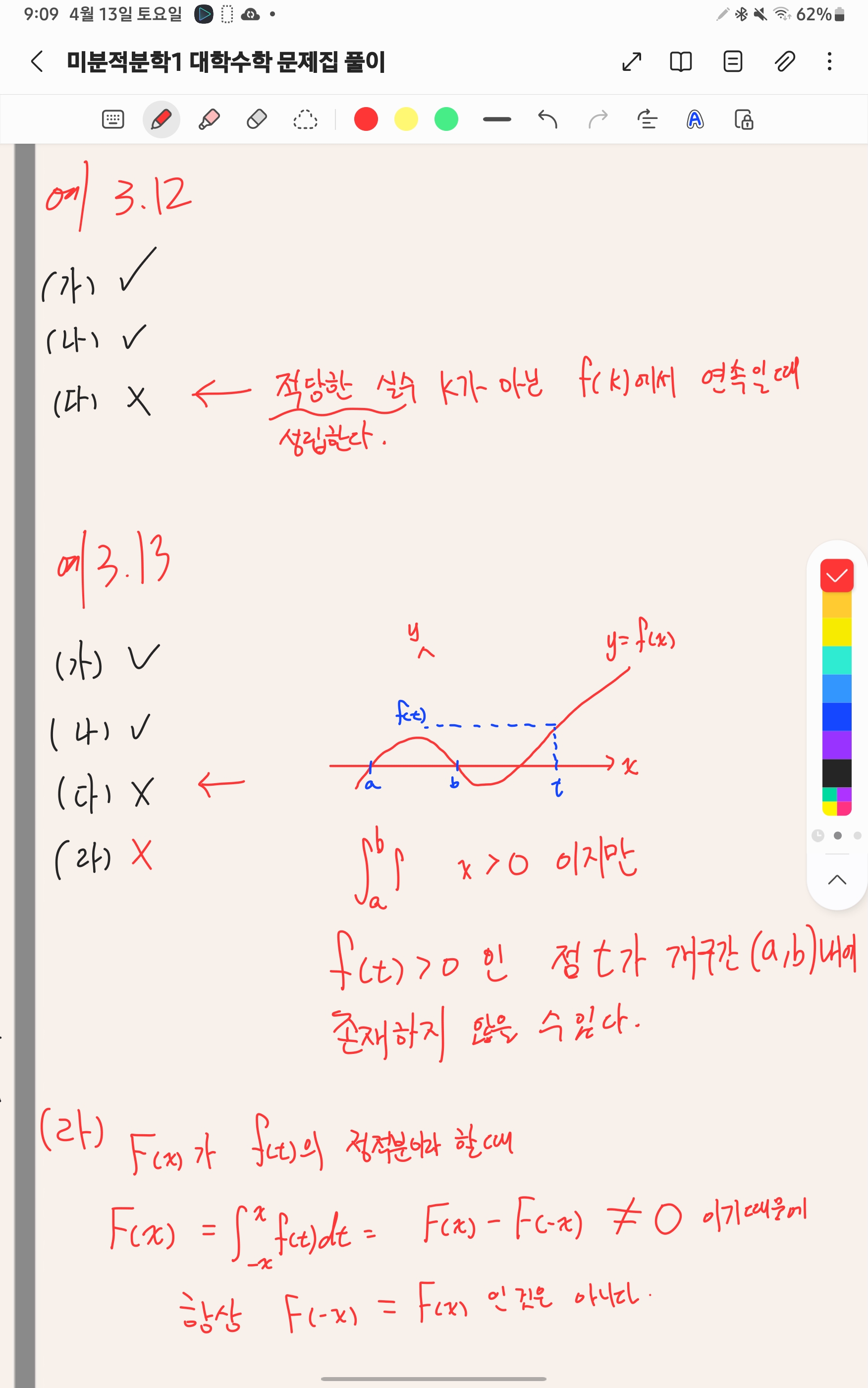 예제 3.12 (다)에서 적당한 실수 k가 아닌 f(k)에서 연속일 때 성립한다고 하셨는데 왜 답에서는 (다) 가 맞다는 것인가요? 그리고 (라)에서 제가 첨부파일에서 푼 방식이 맞는지 궁금합니다. 감사합니다! 답변 완료된 질문과 답변은 수정 및 삭제가 불가합니다. |