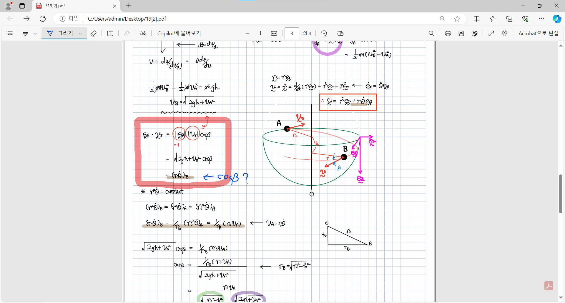 문제에서 풀이할 때는, A점과 B점에서의 r(dθ/dt)값이 같다는 것으로 풀었고, B점의 값을 대입할 때 cosβ가 들어가 있는 것을 확인하실 수 있을 겁니다.