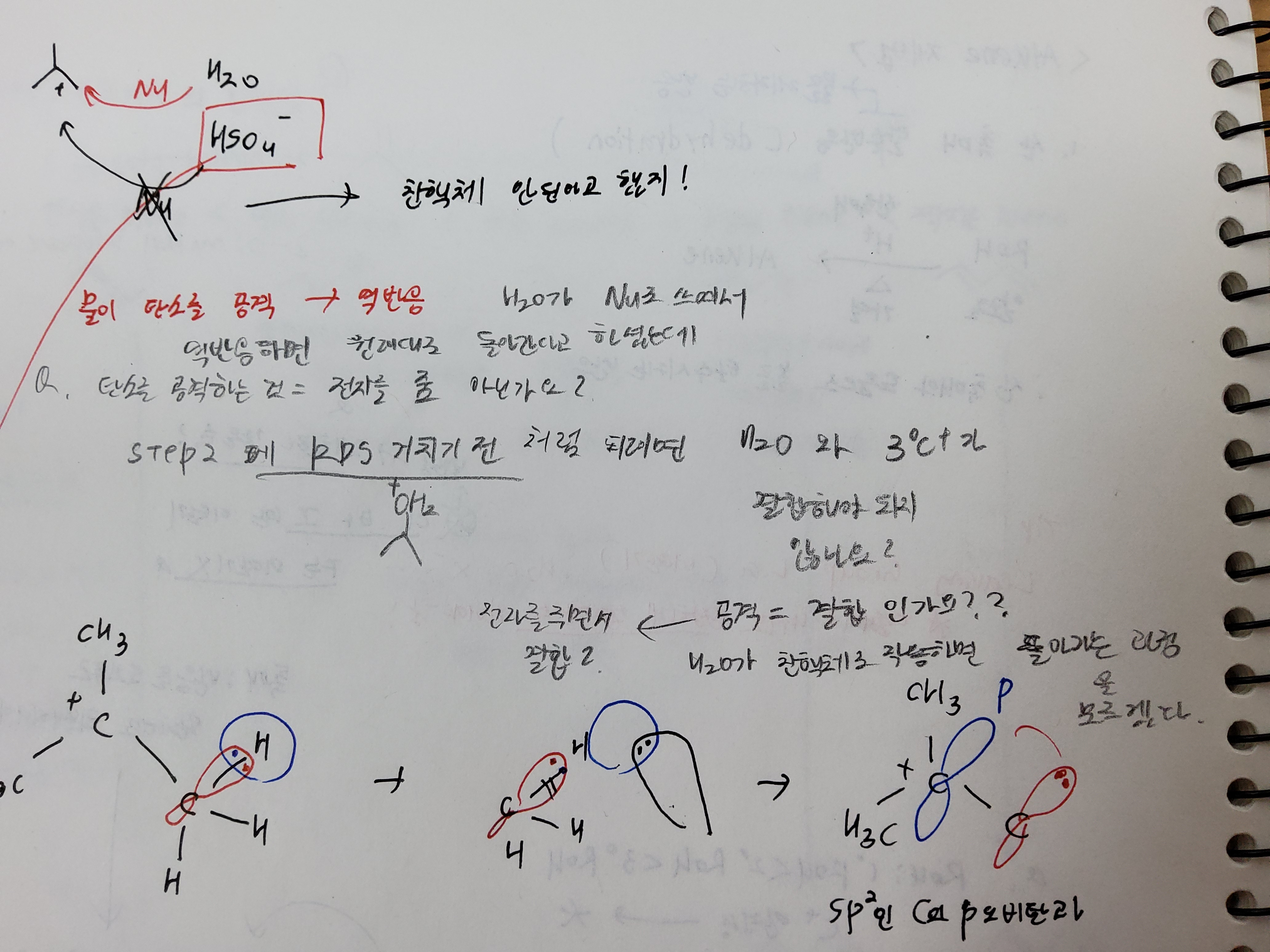 1. 물의 산소가 비공유 전자쌍을 탄소양이온에게 주는 것 = 산소의 비공유 전자쌍이 들어 있는 sp3 혼성오비탈이 탄소의 비어있는 p오비탈과 겹치는 것