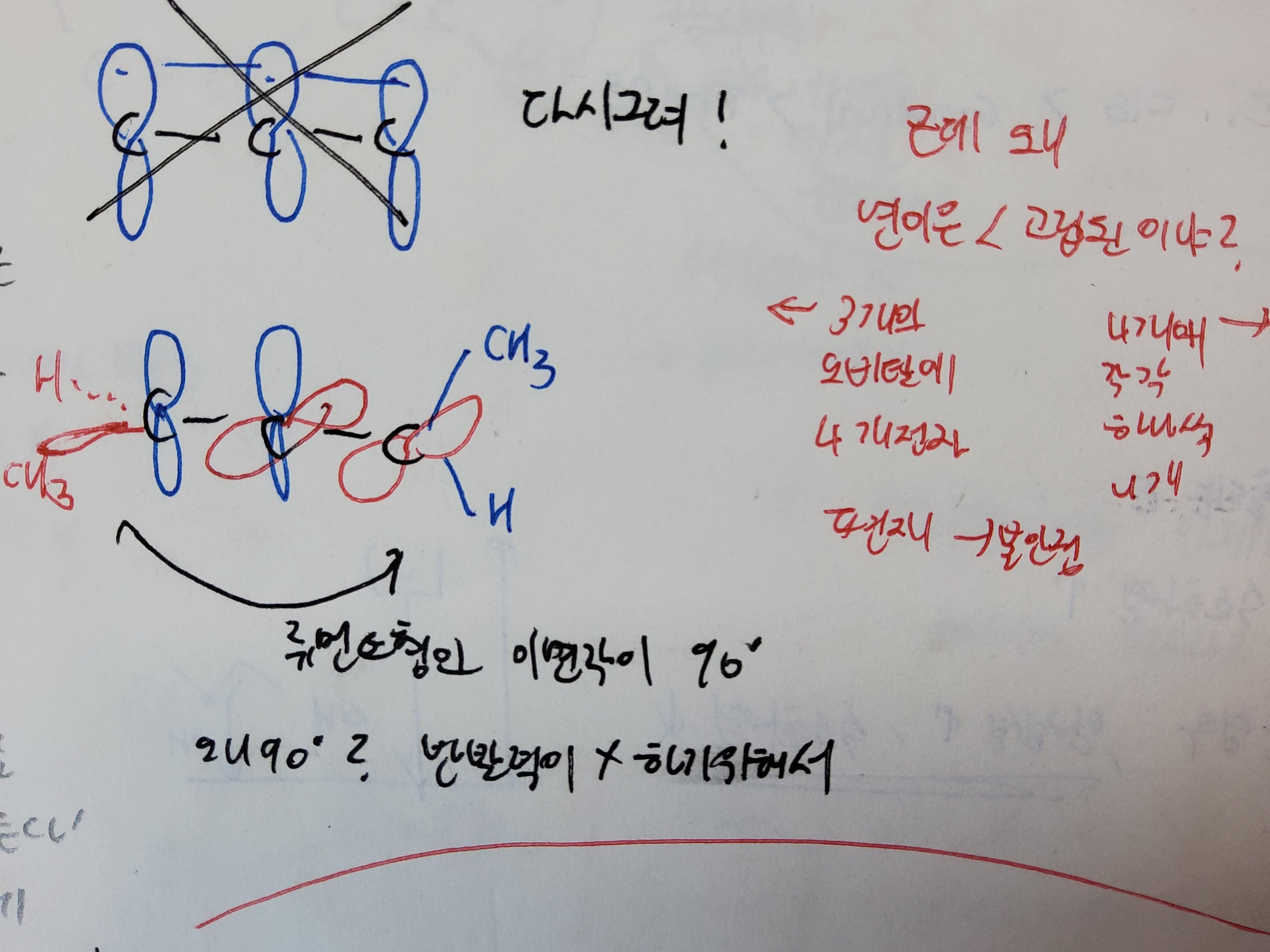 중심탄소를 기준으로 왼쪽의 이중결합을 구성하는 p 오비탈과 오른쪽의 이중결합을 구성하는 p 오비탈 역시 직각으로 배치됨을 알 수 있습니다.
