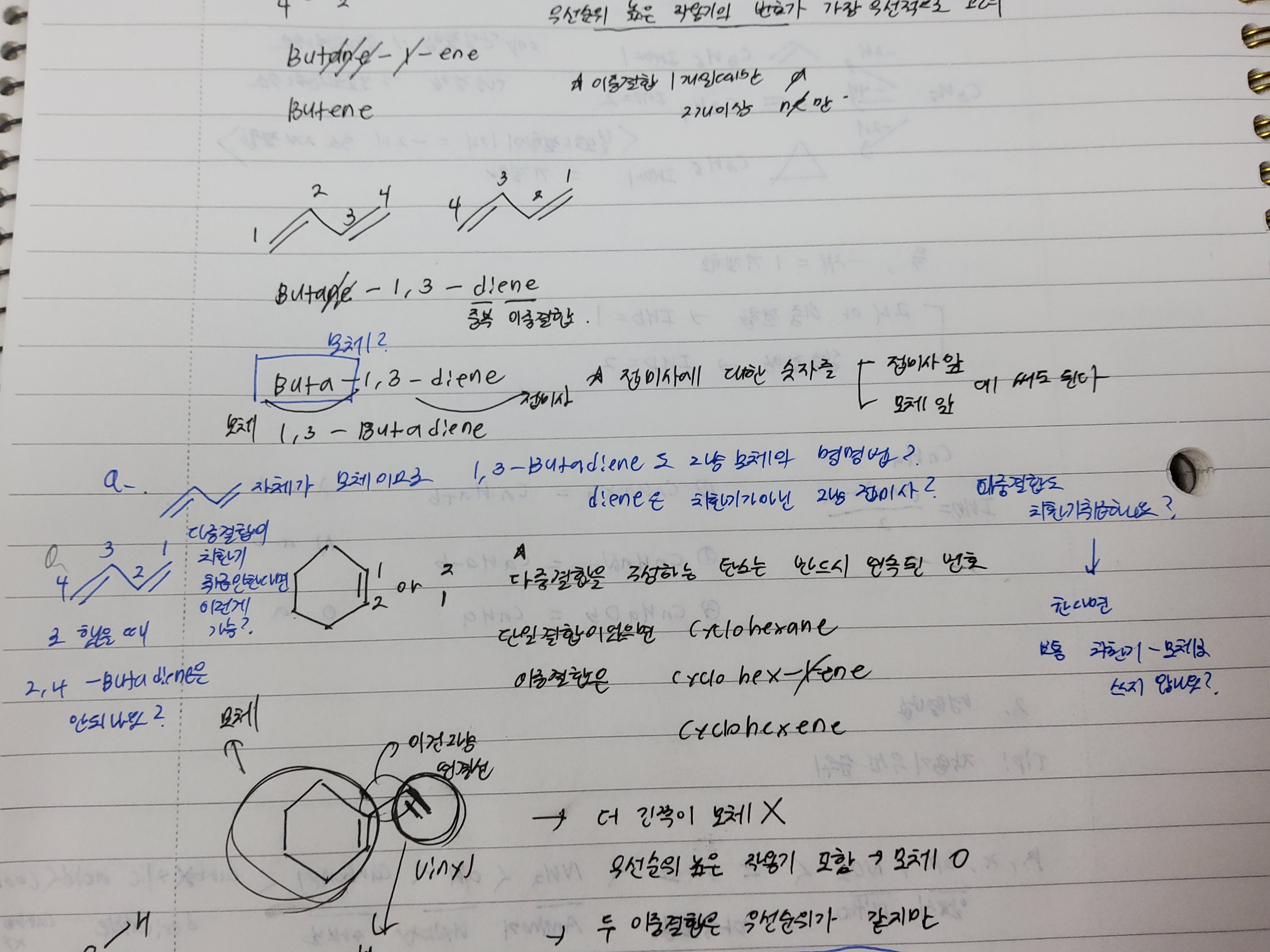 1.Buta 1 3 diene도 그냥 모체의 명명법인가요? 2.diene은 치환기가 아닌 그냥 접미사인가요? 3.이중결합을 치환기 아니면 작용기 취급을 한다면 보통 치환기-모체 순으로 쓰지 않나요? 4.다중결합이 작용기 취급이 안한다면 왼쪽 파란색과같이 2 4 Butadiene은 안되나요? 안된다면 이유가 뭔가요?