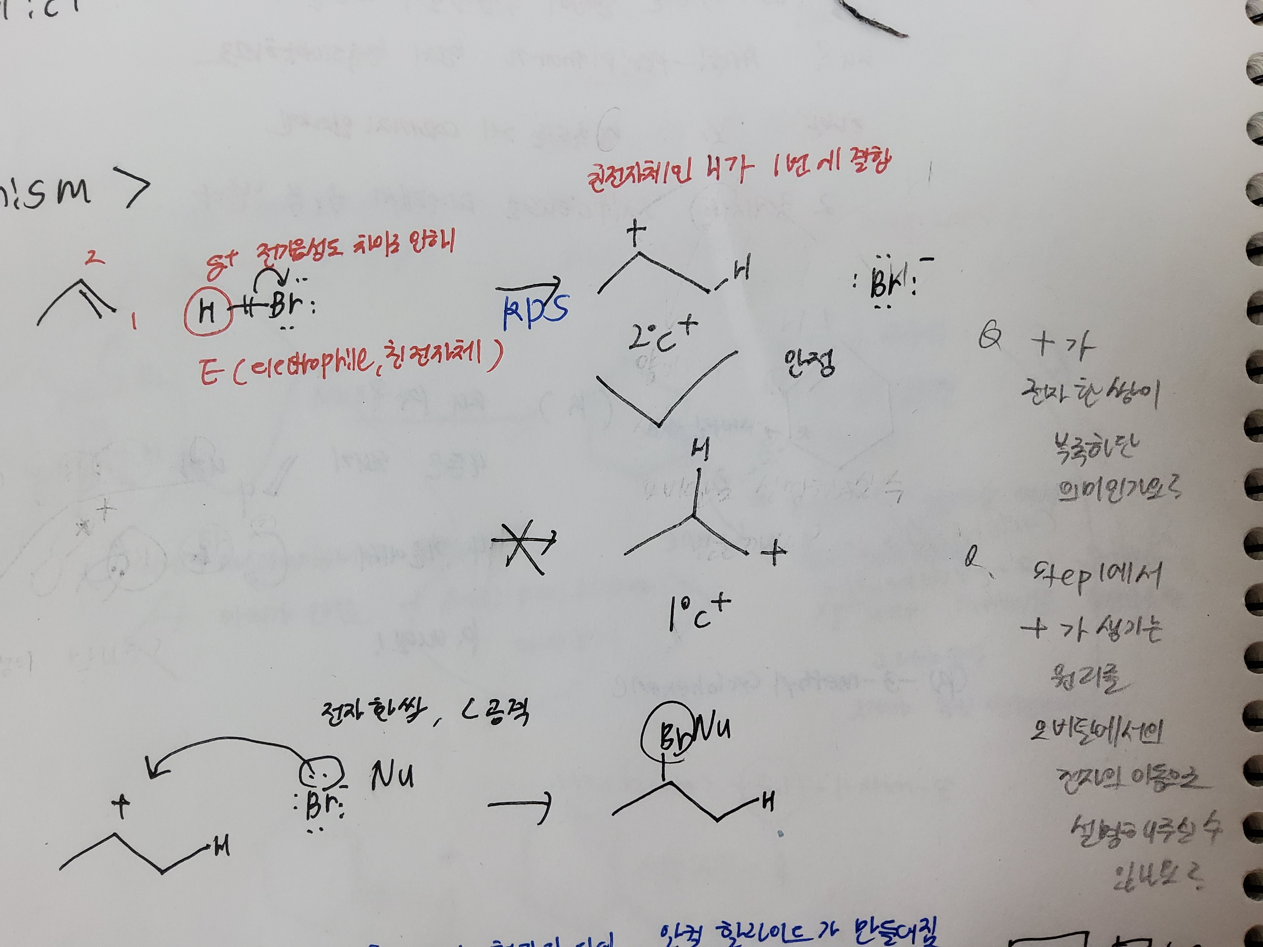 1.step1에서 1번자리에 수소가 결합되었을때 그 자리에서 단일결합된 2번자리에 탄소가 양이온이 되는 이유를 잘 모르겠습니다 그 원리를 오비탈에서의 전자이동으로 설명해주실 수 있을까요?
