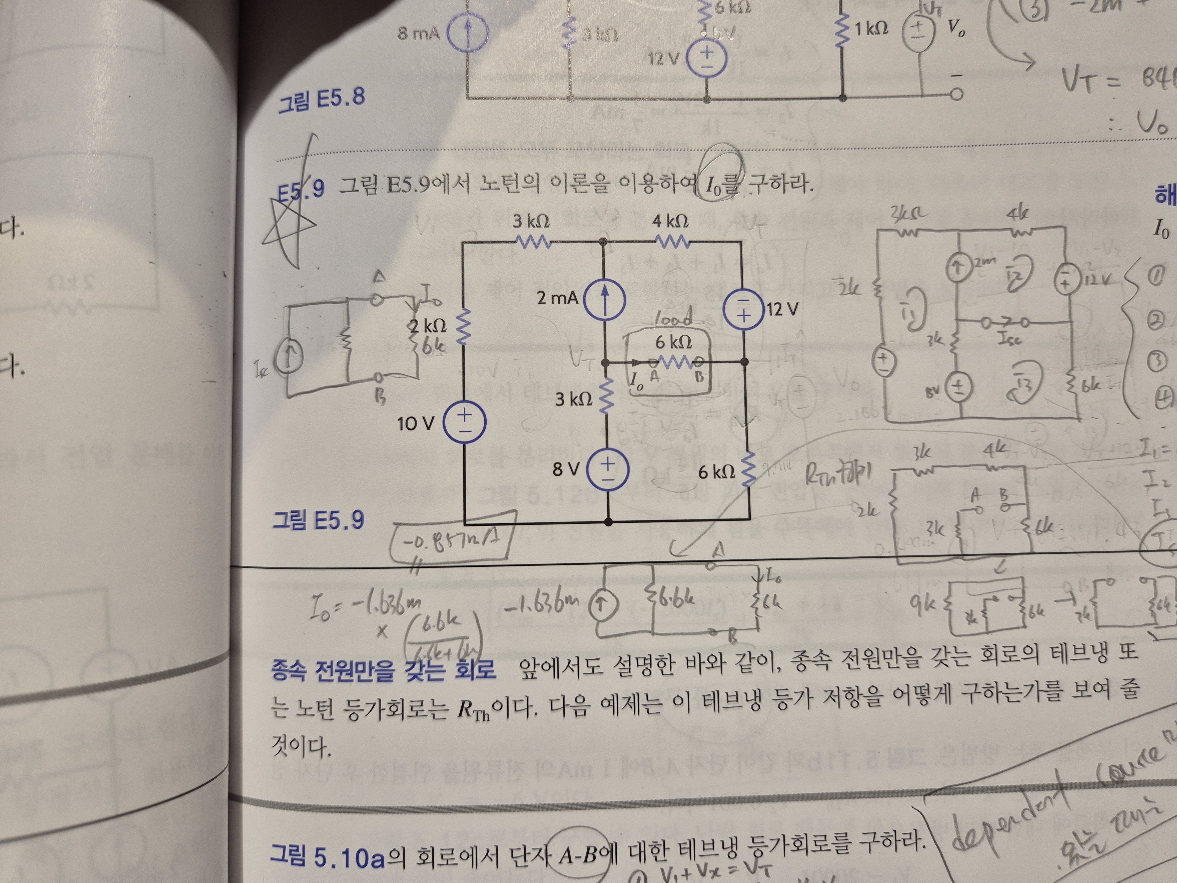 이를 바탕으로 전류분배법칙으로 Io를 구하면 Io=-3/3500[A]가 나옵니다.(여백에 풀어 놓으신 내용을 보니 맞게 푸신 것 같습니다.)