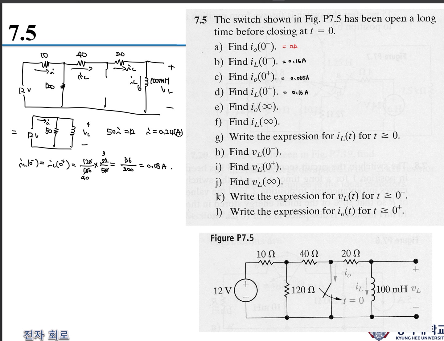 (b)번에서 등가저항으로 바꾼 후 전압 차가 같다는 것으로 i 의 값을 구하여 120옴과 40옴의 전류분배를 쓰면 틀린 풀이인가요? 답변 완료된 질문과 답변은 수정 및 삭제가 불가합니다. |