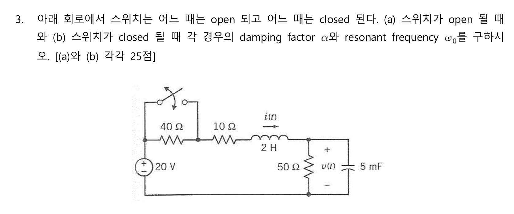 스위치가 open된 경우의 풀이를 첨부하오니 이를 참고하여 스위치가 closed된 경우를 풀어보시기 바랍니다.