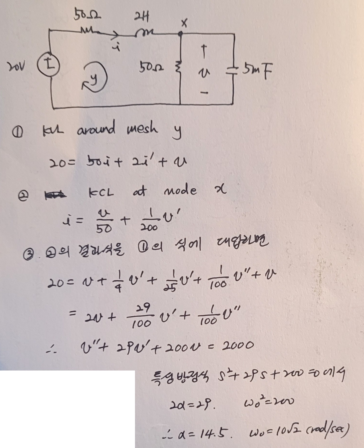 회로변수는 인덕터전류와 커패시터전압를 모두 미지수로 잡아 이를 적절히 연립하여 인덕터전류 또는 커패시터전압에 관한 미분방정식을 구해야 합니다.