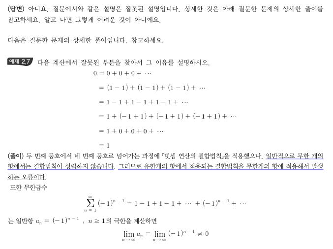 p. 311 예제 2.7) 잘못된 부분을 찾아서 이유를 설명하시오. 문제에서 0 = 0 + 0 + 0 ... = (1-1) + (1-1) + (1-1) + ... = 1 - 1 + 1 - 1 + 1 - 1 + ... = 1 + ( -1 + 1 ) + ( -1 + 1 ) + ... = 1 여기서 4 번째 등식 = 1 + ( -1 + 1 ) + ( -1 + 1 ) + ... + - 1 1의 짝이 되는 -1이 이 식의 마지막에 하나 무조건 남기 때문에 0 = 1 이 아니고 0 = 0 이다. 이렇게 설명해도 되는지 궁금해서 질문 드립니다.