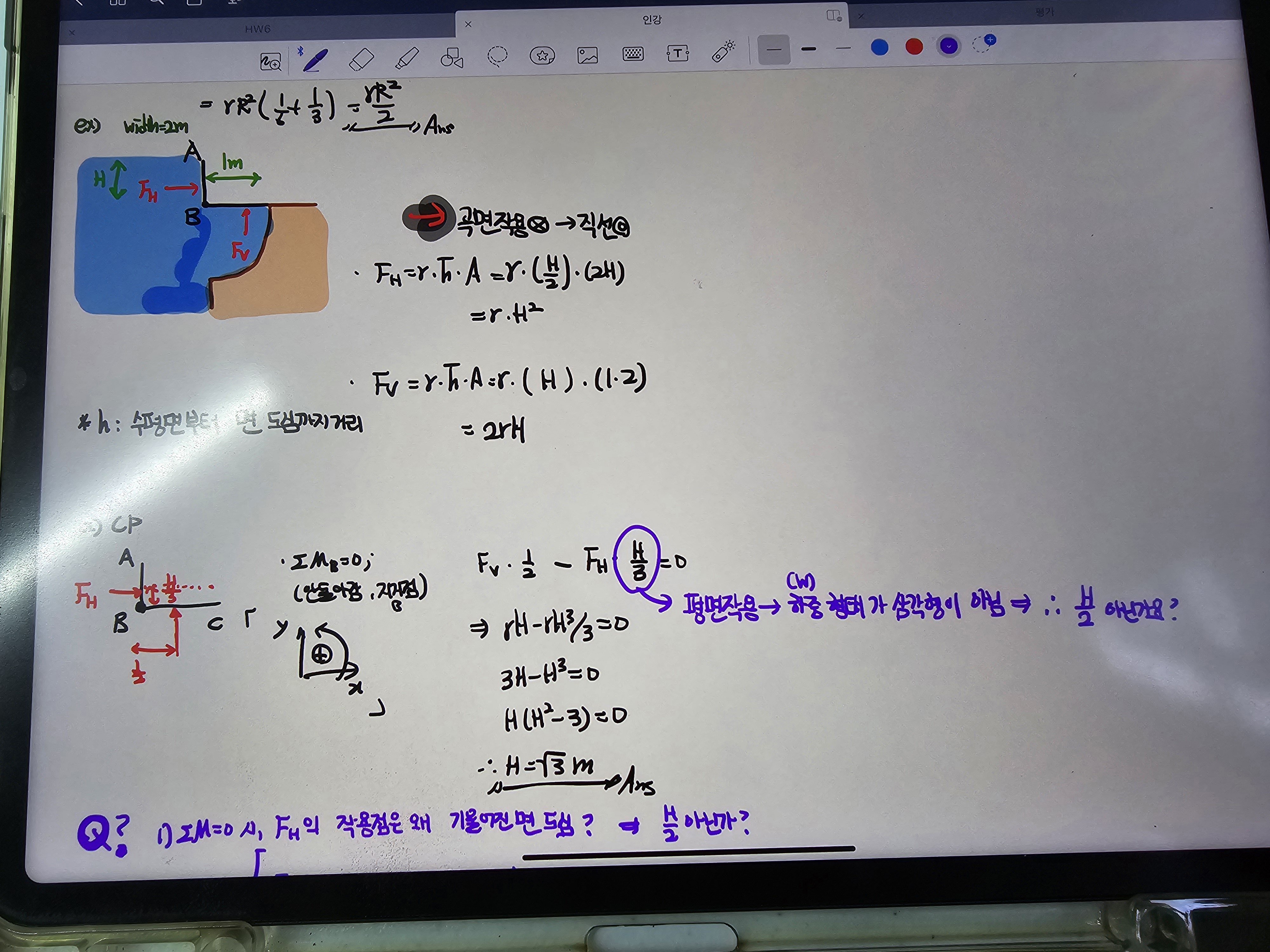 안녕하세요 작용형태가 기울어진 경사면이 아닌 평면이라 평면 도심인 H/2가 수평전압력의 작용 위치아닌가요? 답변 완료된 질문과 답변은 수정 및 삭제가 불가합니다. |