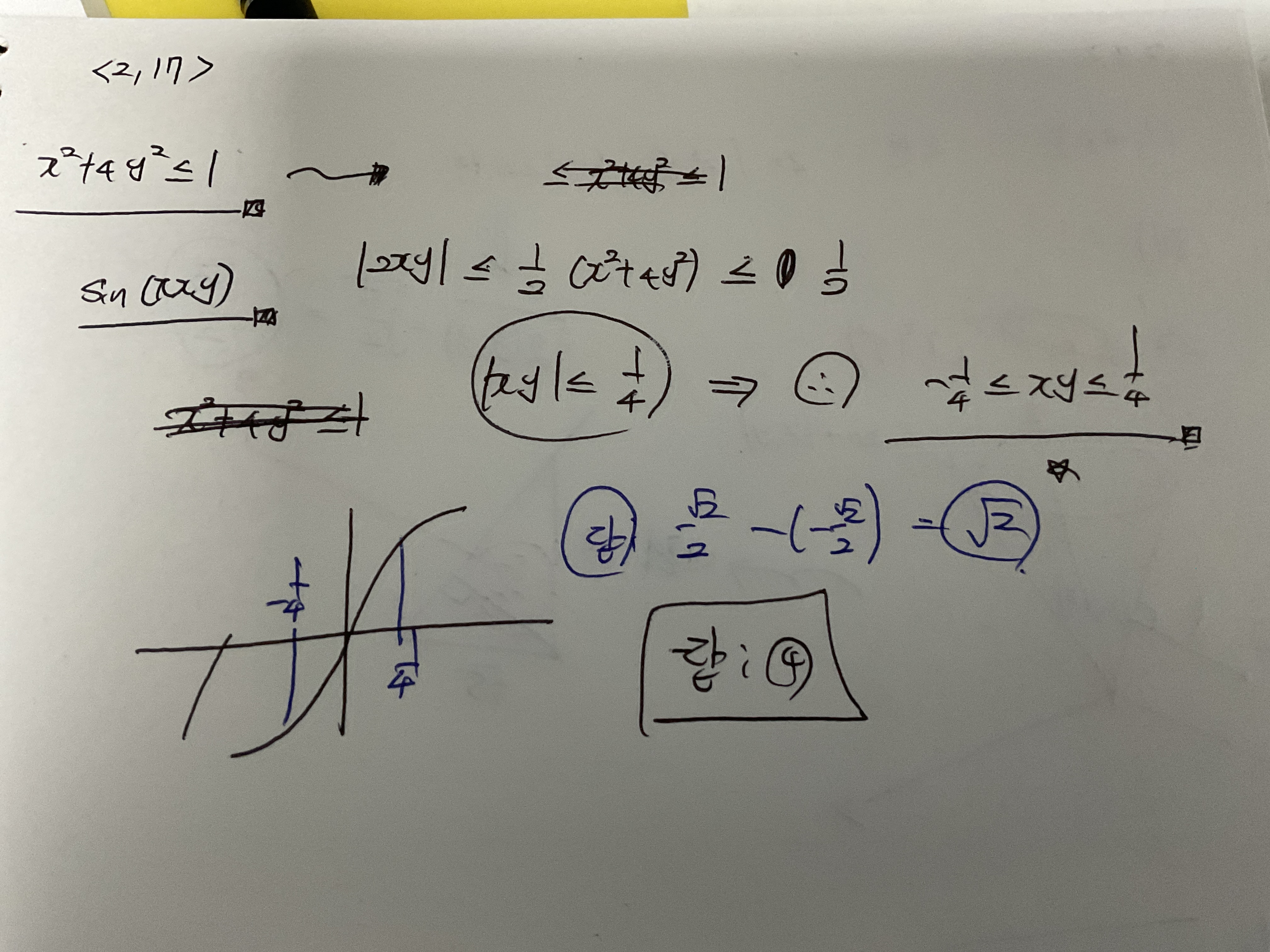 절대부등식 |ab| =< 1/2(a^2 + b^2) 을 이용하여 xy의 범위를 구한후 sin 그래프를 통해 문제를 풀이하였는데 해당 문제는 이와같이 푸는것이 해설과 맞는지 궁금합니다. 답변 완료된 질문과 답변은 수정 및 삭제가 불가합니다. |