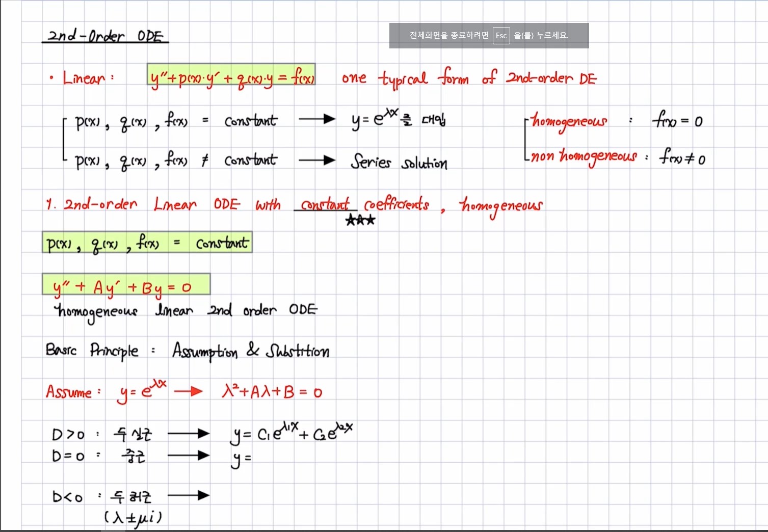 y를 e람다 x로 가정했을 때 2차선형미분방정식에 대입하면