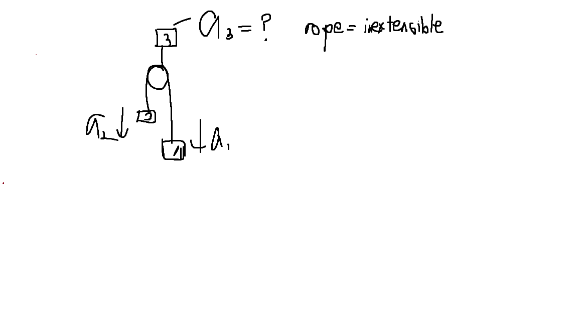 지면에 대해 1과 2의 가속도 크기가 동일하고 방향이 반대라면 일종의 고정도르래에 연결된 것과 같기 때문에 3의 가속도는 0이 됩니다.
