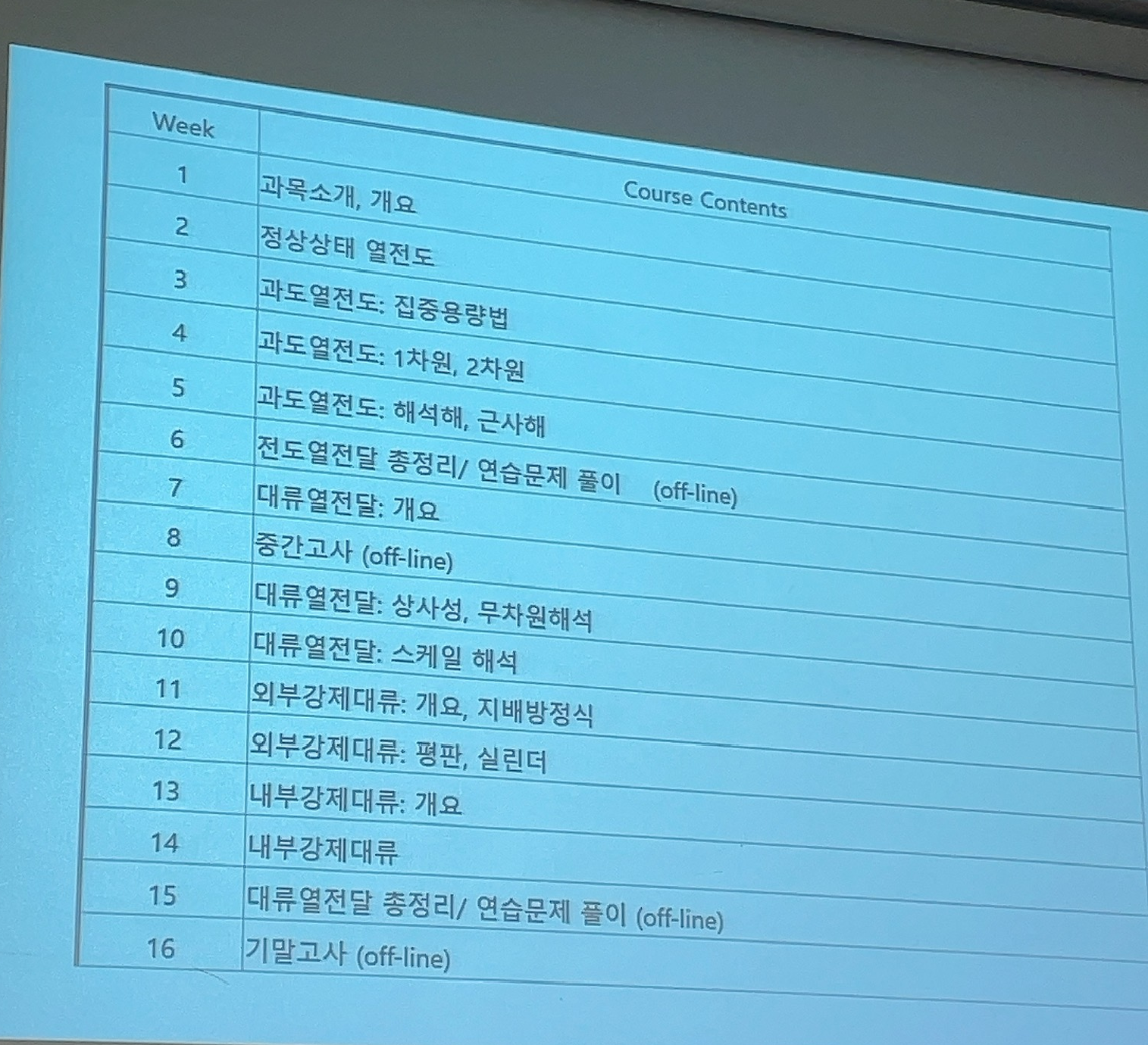 첨부해 주신 사진을 기반으로 볼 때, 9~15주는 외부와 내부의 대류입니다. 제 강의 25~40강에 해당하는 부분입니다. 목차에 나오는 질문을 참고해 주세요.