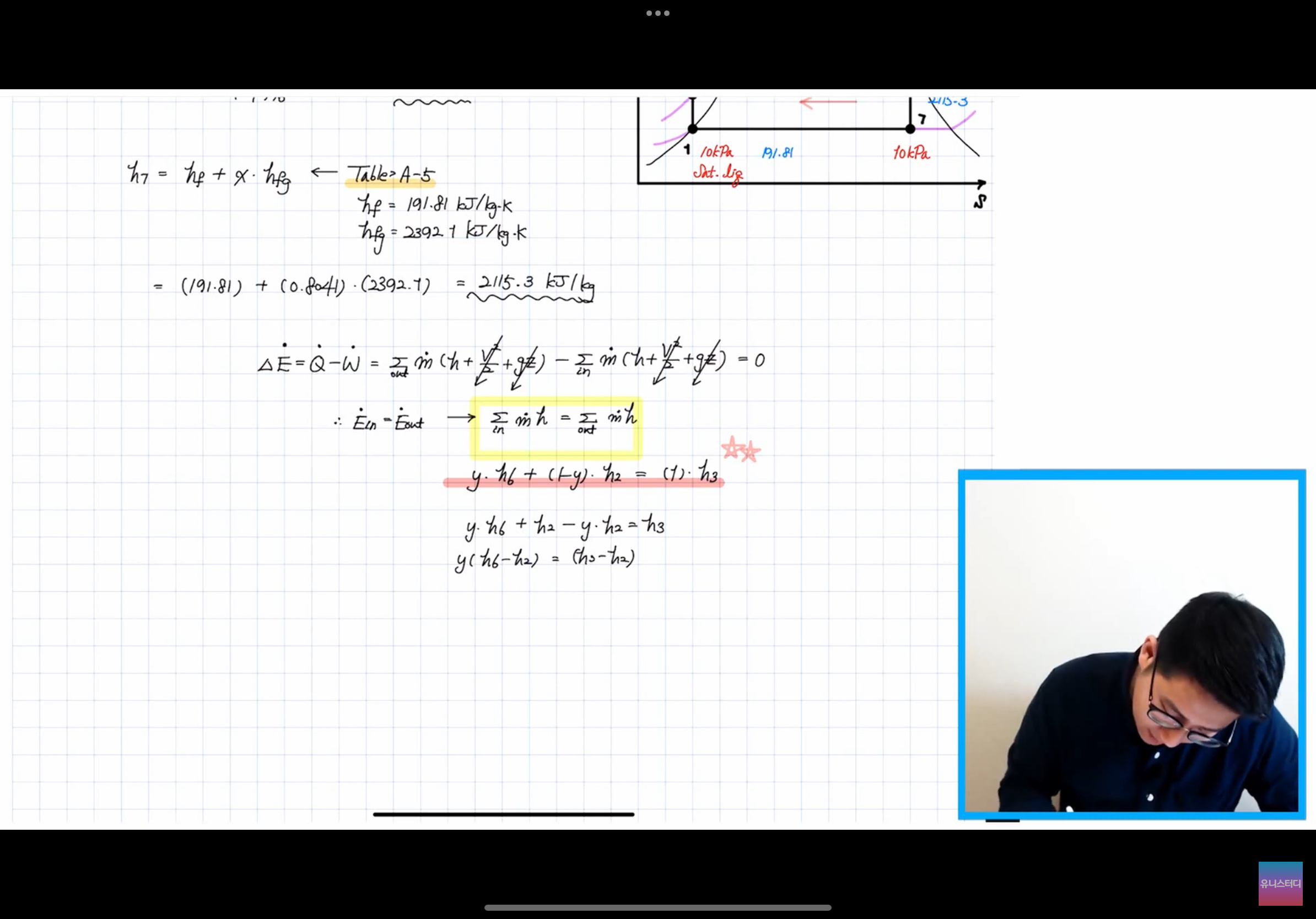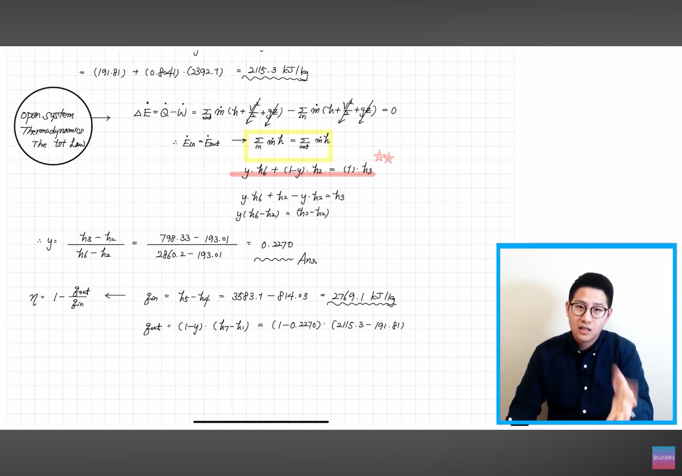 재생 랭킨 사이클 문제 질문입니다. y를 구할 때 시간에 따른 에너지 평형식을 사용하셨는데 이 때 2-3구간 정압과정에서 가열량을 넣지 않고 엔탈피만 계산하신 이유가 무엇인가요?