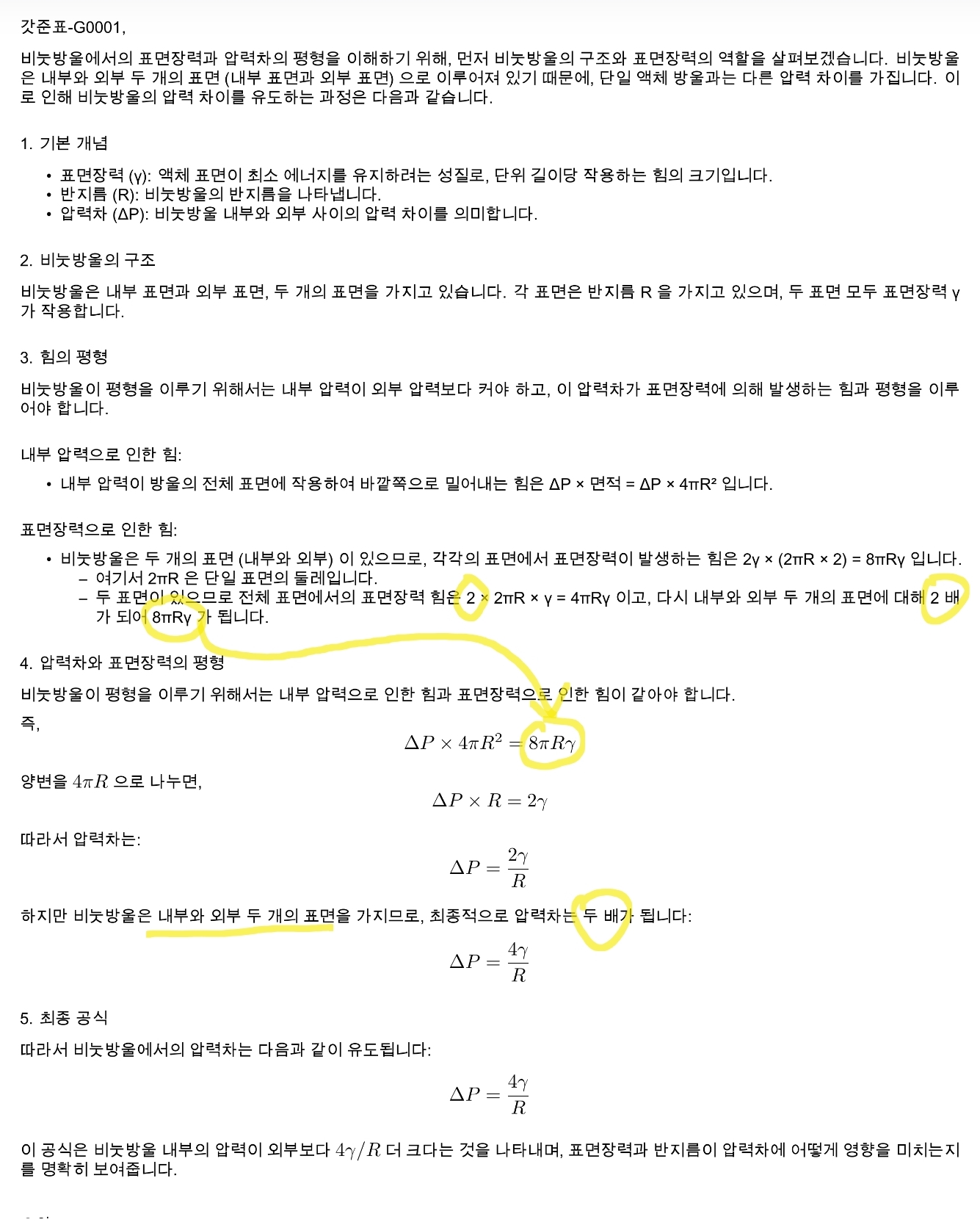 정석적인 비눗방울의 표면장력의 유도는 아래 첨부된 사진을 참고하시기 바랍니다.