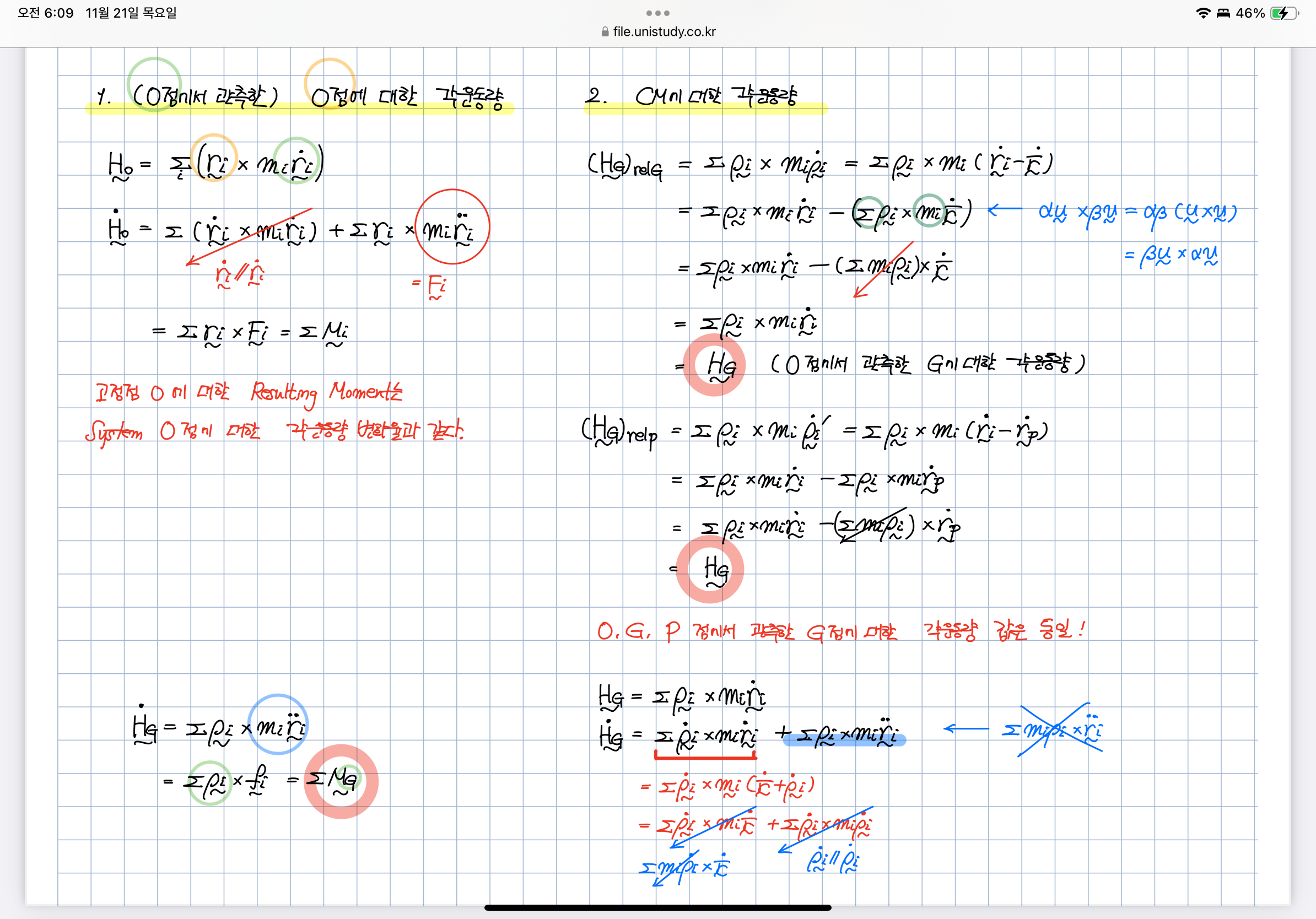 교수님이 전 강의에서 Σ miρ i=0이라고 하시고 22강 내용에서 cm에대한 각운동량을 유도할 때 지우셨는데 앞에 있는 Σ ρ i x mi ri=0 는 지우지 않아도 되는지 궁금합니다 뒤의 강의를 들으면 지우시는 부분도 있고 안지우시는 부분도 있어서 질문 드립니다.