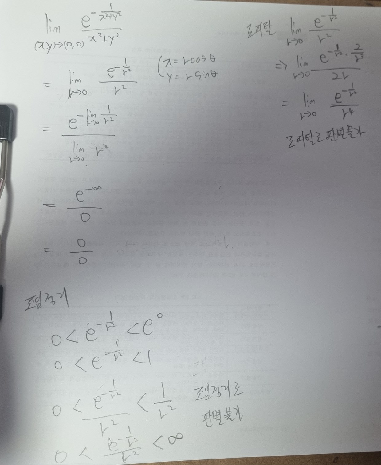 선생님 안녕하세요 p103 4.4 다 를 극좌표를 이용햇는데 0/0 꼴이 나와 조임정리와 로피탈을 사용햇음에도 판별이 불가해서 질문을 드립니다. (첨부파일에 풀이 적음) 어떻게 풀어야하는지 궁금합니다. 답변 완료된 질문과 답변은 수정 및 삭제가 불가합니다. |