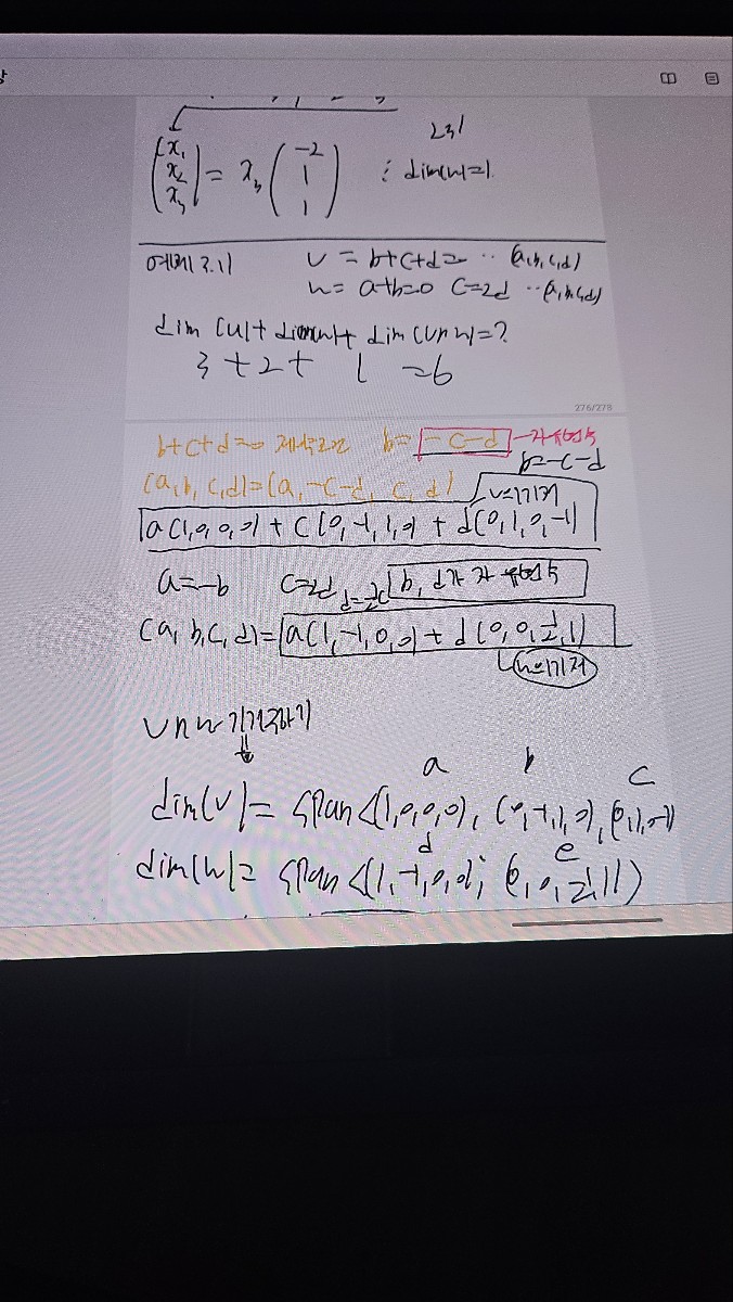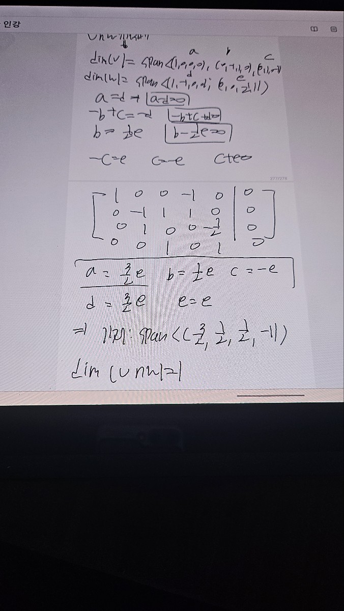 항상 좋은 강의 잘 듣고 있습니다. 예제 3.11에 답은 맞았는데 풀이과정도 맞는지 궁금하고 항상 U∩v 의 기저 구하는 방법을 정확히 모르겠어서 이렇게 질문 올립니다. 또 다른 방법으로 제가 생각해본것은 dim(u+V)=dim(u)+dim(v)-dim(u∩v) 이므로 dim (u+v)의 rank(u+v)을 구하기 위해서 행렬을 써보면 1 0 0 0 0 -1 1 0 0 -1 0 1 1 -1 0 0 0 0 0.5 1 이 행렬을 풀어보면 한행이 다 0이 나오는 행이 있으니 rank가 4 즉 dim(u+v)=4. 위의식 을 이용해 구해보면 dim(u∩v)=1 따라서 3+2+1=6 이렇게 풀어봤는데 이렇게 푸는방법도 맞는지 궁금합니다. 편입시험 준비보다는 대학교 수업때 이해안되는 선형대수학 개념 및 연습문제좀 풀고 싶어서 이렇게 풀이과정을 하나하나 다 적은점 양해 부탁드립니다. 답변 완료된 질문과 답변은 수정 및 삭제가 불가합니다. |