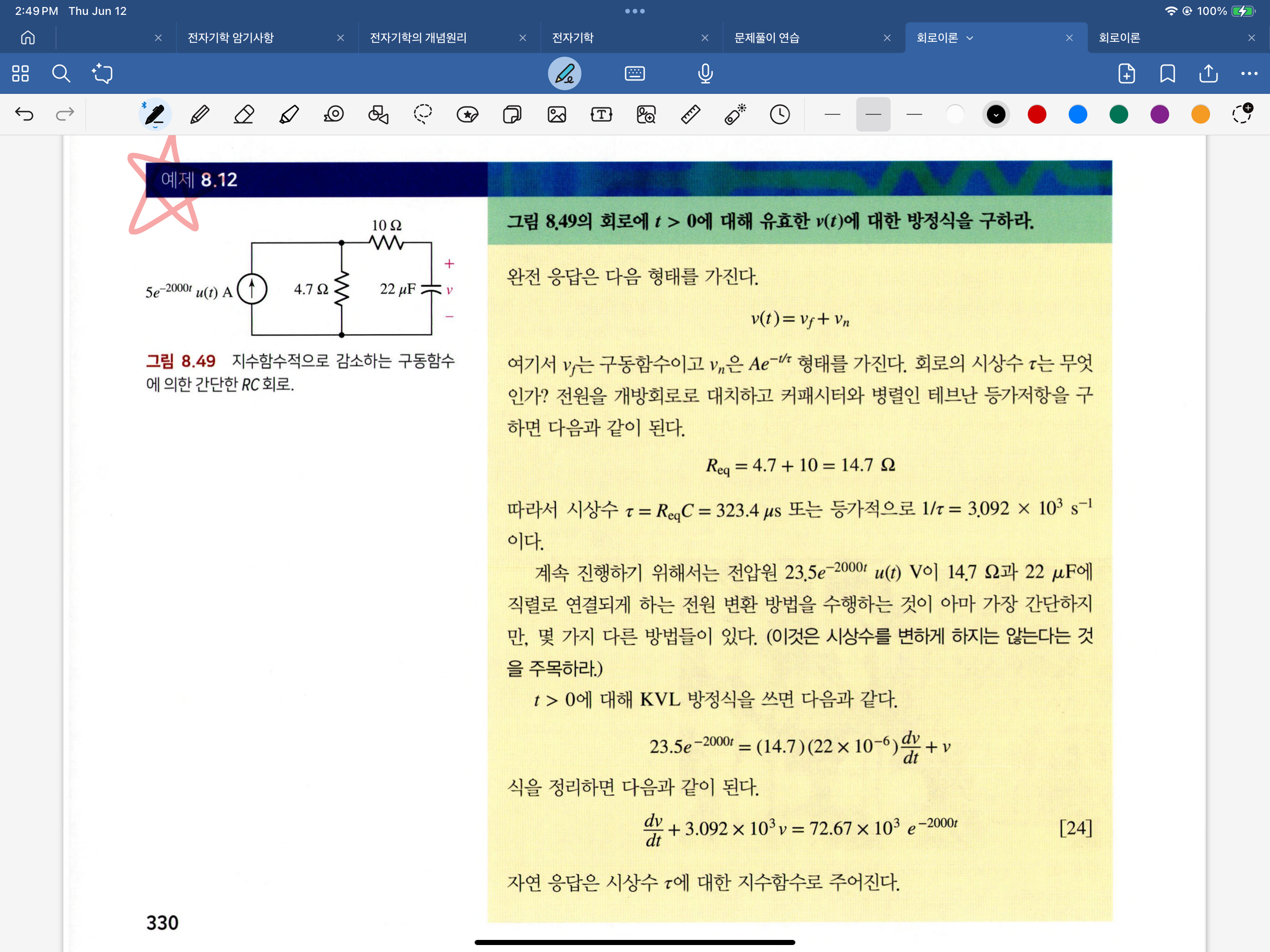 그래서 사진 속 회로처럼 직류가 아닌 지수함수꼴의 전원이 있는 경우는 미분방정식 또는 라플라스변환을 이용해서 구해야 합니다.