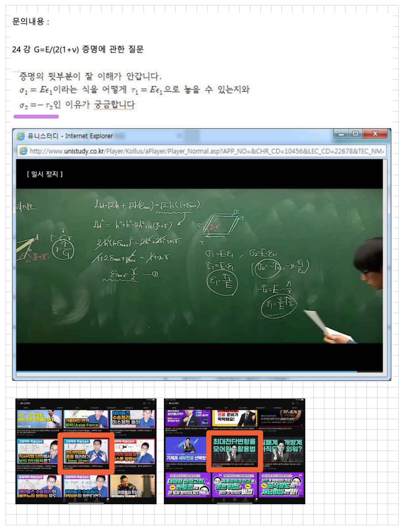권준표 교수님의 강좌와 첨부된 판서PDF파일에서 동영상 캡쳐본을 제시하며, 해당 영상이 유튜브에 게시되어 있다고 하시며 동영상을 참고 바란다고 하셨는데 해당 동영상을 찾을 수 없습니다. 유니스터디 학습Q&A와 질의응답의 답변 내용을 바탕으로 제작한 동영상이 존재한다고 하시며, 강좌에서 해당 내용 설명을 생략하였는데, 설명 내용을 꼭 공부하고 싶습니다. 사진에 해당하는 동영상을 유니스터디 내에서 확인할 수 있는 방법은 무엇인가요? 혹은, 리뉴얼 되기 전인 2016년 고체역학 강의에서는 설명되어 있는 듯 한데 리뉴얼 전의 고체역학 강의를 수강할 방법은 없는 것인가요? #유니스터디학습Q&A #전단변형율 증명 정리하기 #최대전단변형률 모어원 활용법 답변 완료된 질문과 답변은 수정 및 삭제가 불가합니다. |