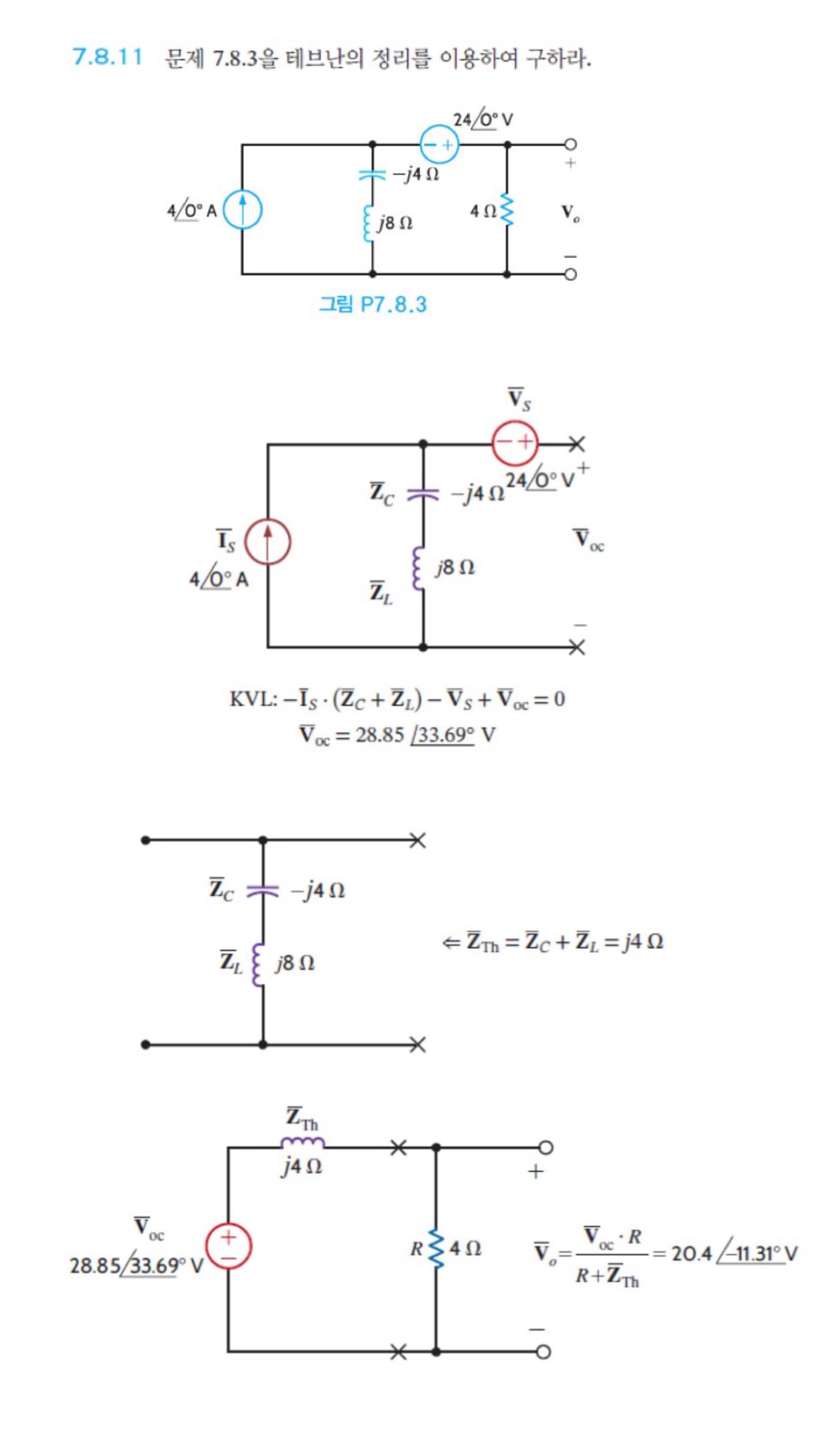 즉, 솔루션처럼 4옴 저항을 제거한 상태에서 즉, 4옴 저항에서 좌측을 바라본 테브넌 등가회로를 구하면 솔루션처럼 풀이가 되므로 Vth=24+j16[V], Zth=j4[Ω]이 맞습니다. 따라서 이 경우 전압분배법칙에 의해 Vo=4/(j4+4)×Vth=20-j4[V]입니다.