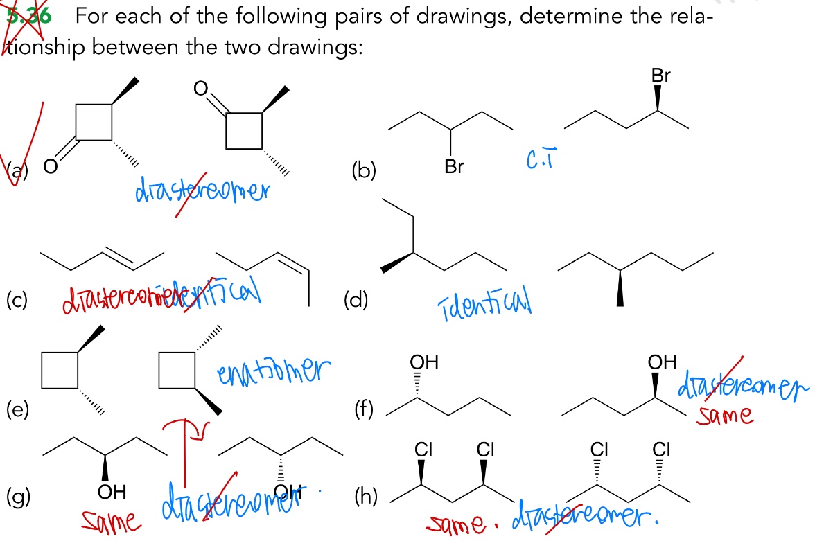 이 문제들에서 same인지 diastereomer 판정이 너무 어렵습니다. 뒤집었을때 같으면 same이면서 diastereomer인가요? 그렇다면 same이랑 diasteremer의 차이점은 뭔가요?