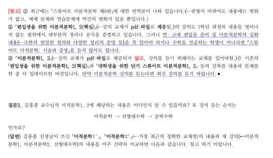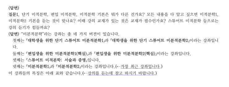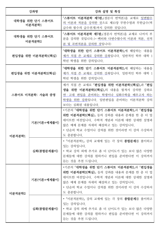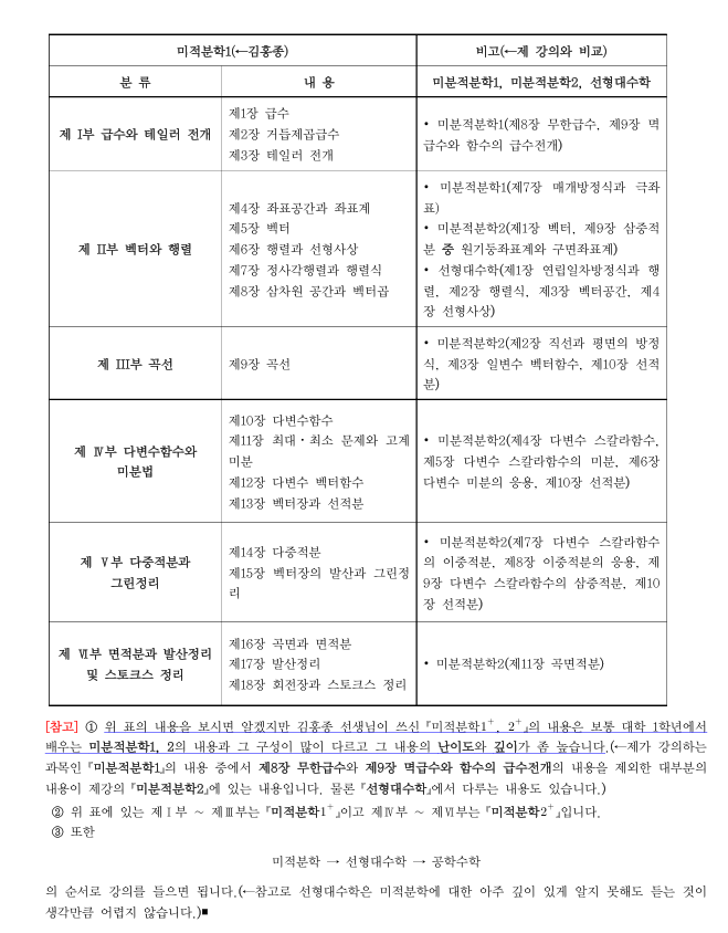 단기 미적분학, 편입 미적분학, 미적분학 기본은 뭐가 다른건가요? 모든 내용을 다 알고 싶으면 미적분학1, 2 기본을 듣는 것이 맞나요? 이때 강의 교재가 있는 것은 교재가 필수인가요? 스튜어트 미적분학 등으로는 강의 듣기가 힘들까요? 김홍종 교수님의 미적분학1, 2에 해당하는 내용은 어디인지 알 수 있을까요? 또 강의 듣는 순서는 미적분학 -> 선형대수학 -> 공학수학인가요? 감사합니다! 답변 완료된 질문과 답변은 수정 및 삭제가 불가합니다. |