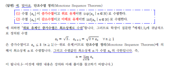 안녕하세요 교수님 기초미분적분학 교재 내 문제에 궁금증이 생겨 질문 남깁니다. 위 문제 2번을 풀 때 lim 값이 증가함수이면서 위로 유계인데 그럼 최소상계로 수렴해야하는것 아닌가 궁금합니다. 제가 47p 내용을 잘못 이해하고 있는 듯 한데 어디서 오류가 있는 것인가요? 감사합니다. 답변 완료된 질문과 답변은 수정 및 삭제가 불가합니다. |