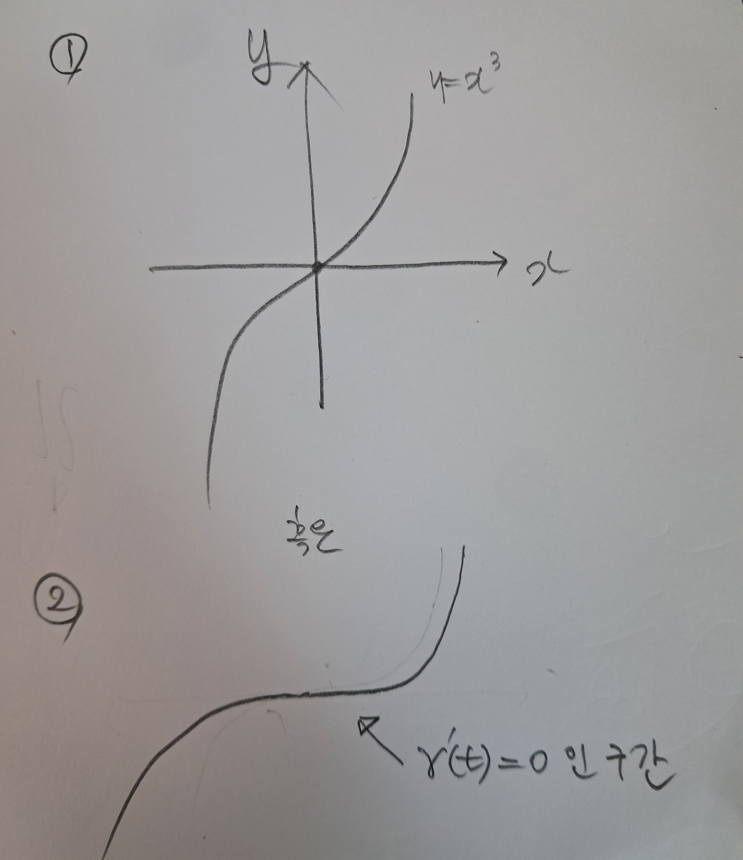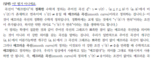 안녕하세요? 공학수학2-94페이지- 36강 듣다가 궁금한 점이 있어 질문 남깁니다. 매끄러운 곡선 정의가 “미분가능하고 감마프라임t가 0이 아니어야한다”고 되있는데(첫번째 사진 첨부) 감마프라임t가 반드시 0이 아니어야 하는 부분이 이해가 잘 안됩니다. 예로 (두번째 사진 첨부) 사진처럼 1)과 2)는 감마프라임t가 0인 구간(혹은 점)이 존재하는데, 저는 매끄러운 곡선이라고 생각하거든요. 시각적으로만 매끄러운 곡선일뿐, 정의에 의한다면 1)과 2)는 매끄러운 곡선이 아닌 걸까요? 답변 완료된 질문과 답변은 수정 및 삭제가 불가합니다. |