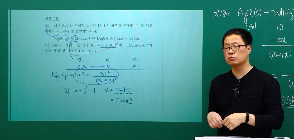 일반화학2의 기출 181번 질문입니다. 문제는 다음과 같습니다. Q) 0.1mol의 AgCl을 녹이기 위하여 1.0L의 용액에 첨가하여야 할 암모니아의 최소량은 몇 몰인가? AgCl(s) + 2NH3(aq) = [Ag(NH3)2]^(+)(aq) + Cl-(aq) (단, AgCl의 용해도 곱 상수 Ksp=1x10^(-10) 이고, [Ag(NH3)2]+의 총괄 생성 상수 K=1x10^(8)이다.) Sol) 교수님의 설명에서는 Ksp와 Kf의 곱이 10^(-2)라고 하였습니다. 하지만 제가 알기론 K(총괄생성상수)=Ksp x Kf 입니다. 이미 문제에서 K의 값이 주어진 바와 같이 Ksp와 Kf의 곱은 1x10^(8) 아닌가요? 혹시 제가 따로 헷갈리는 부분이 있는걸까요? 빠른 답변 감사드립니다. 답변 완료된 질문과 답변은 수정 및 삭제가 불가합니다. |