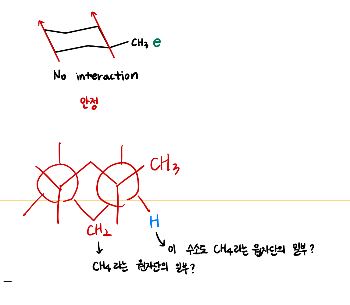 1,3 diaxial 상호작용에서 3번탄소에 결합된 H는 2번탄소에 결합된 CH2 였기에 이렇게 말할 수 있습니다.