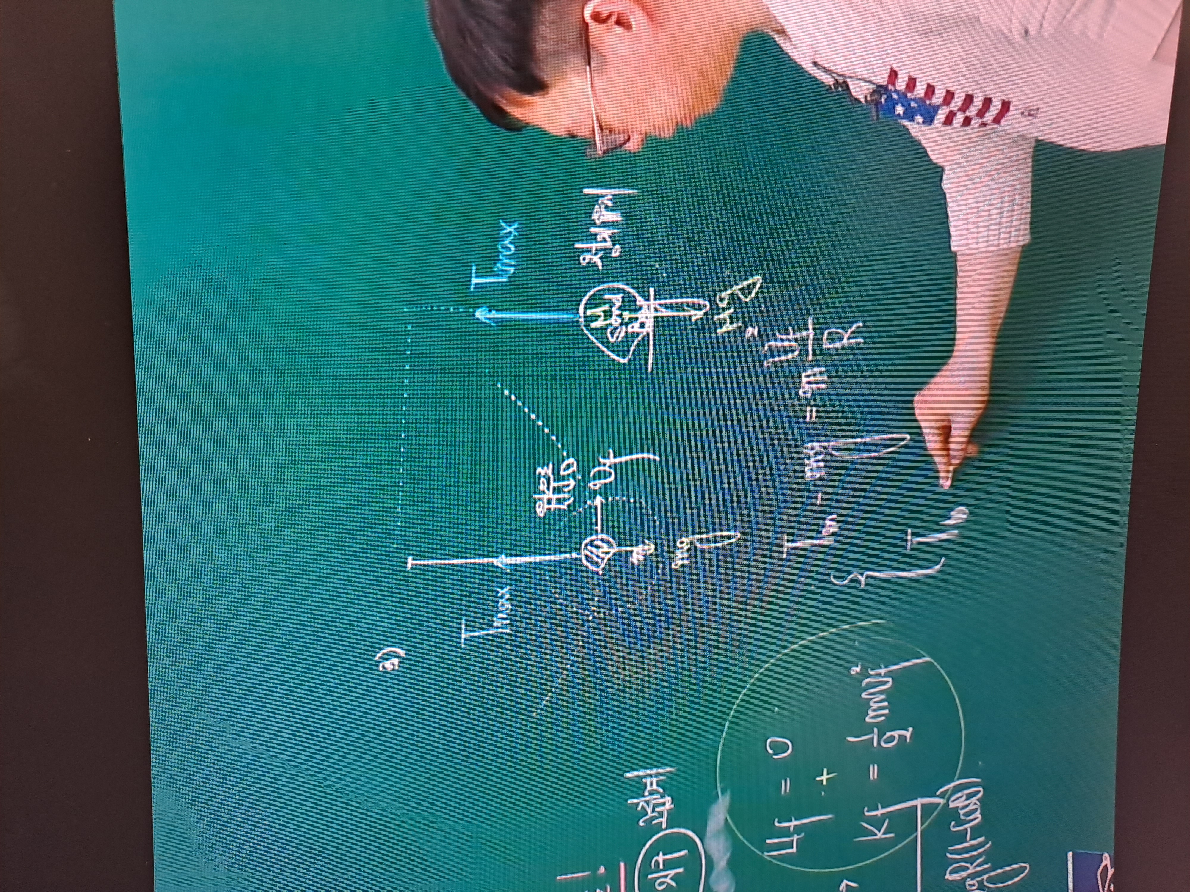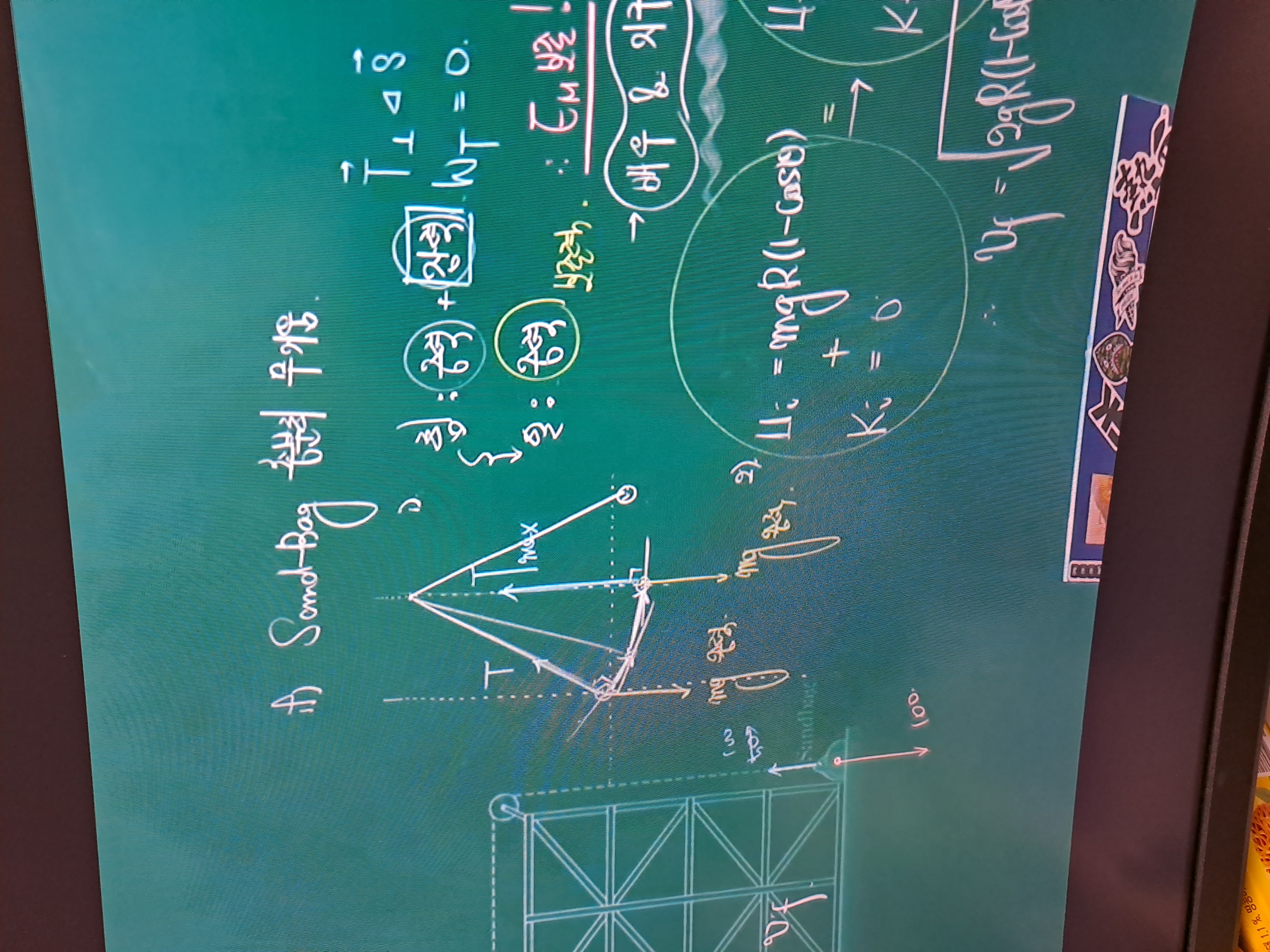 샌드백이 바닥에서 분리되기 직전(즉, 수직항력이 0일 떄)에 장력은 샌드백의 무게와 같은 mg의 크기를 같으며..샌드백이 바닥에서 떨어지지 않은 상황에서 장력의 최댓값이 됩니다.