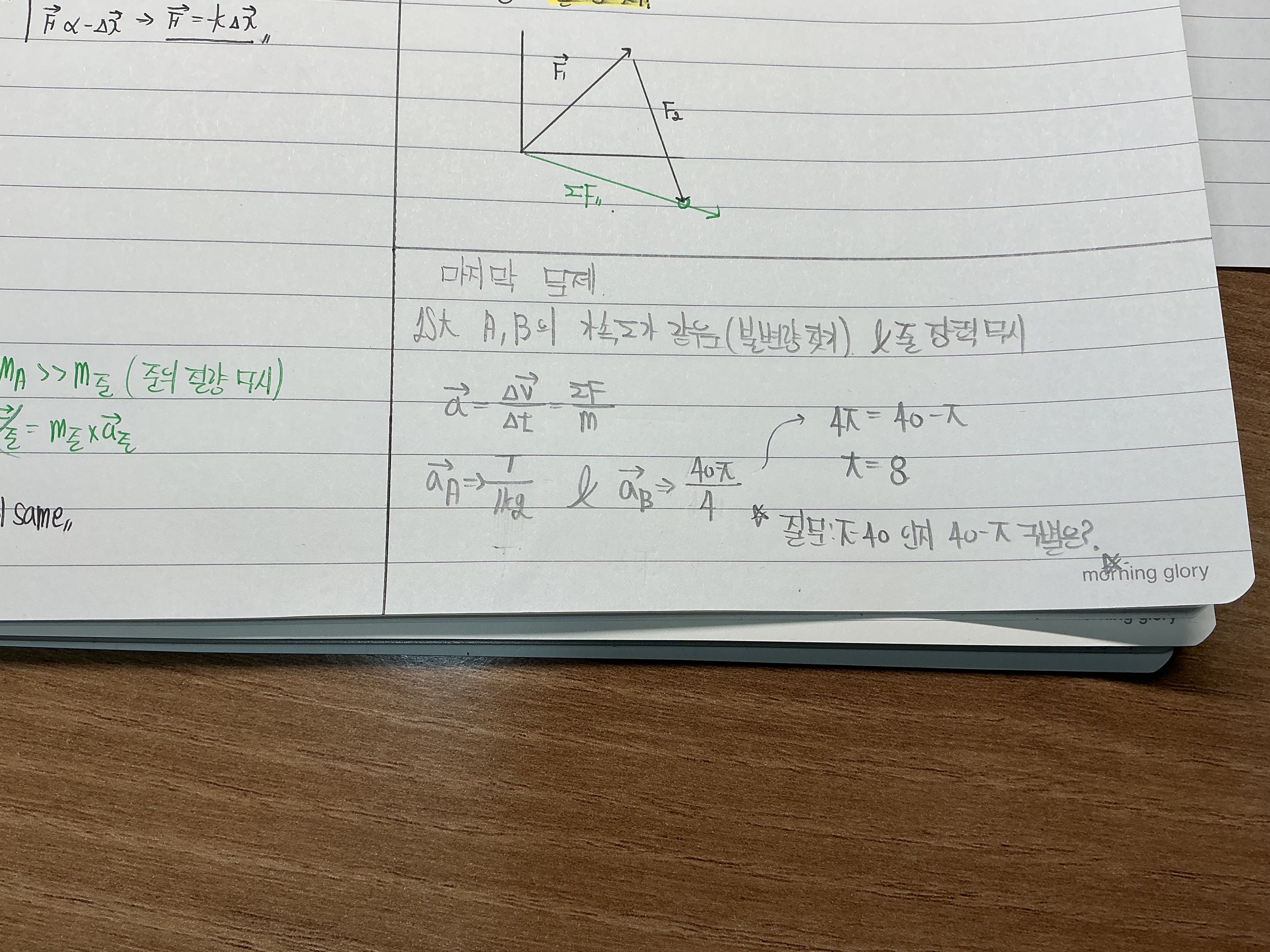 마지막 문제 풀어봤는데 풀이가 맞는지 궁금합니다. 그리고 맞다면 b의 가속도를 구할때 알짜힘이 t-40,40-t인지는 어떻게 구별하는건가요?