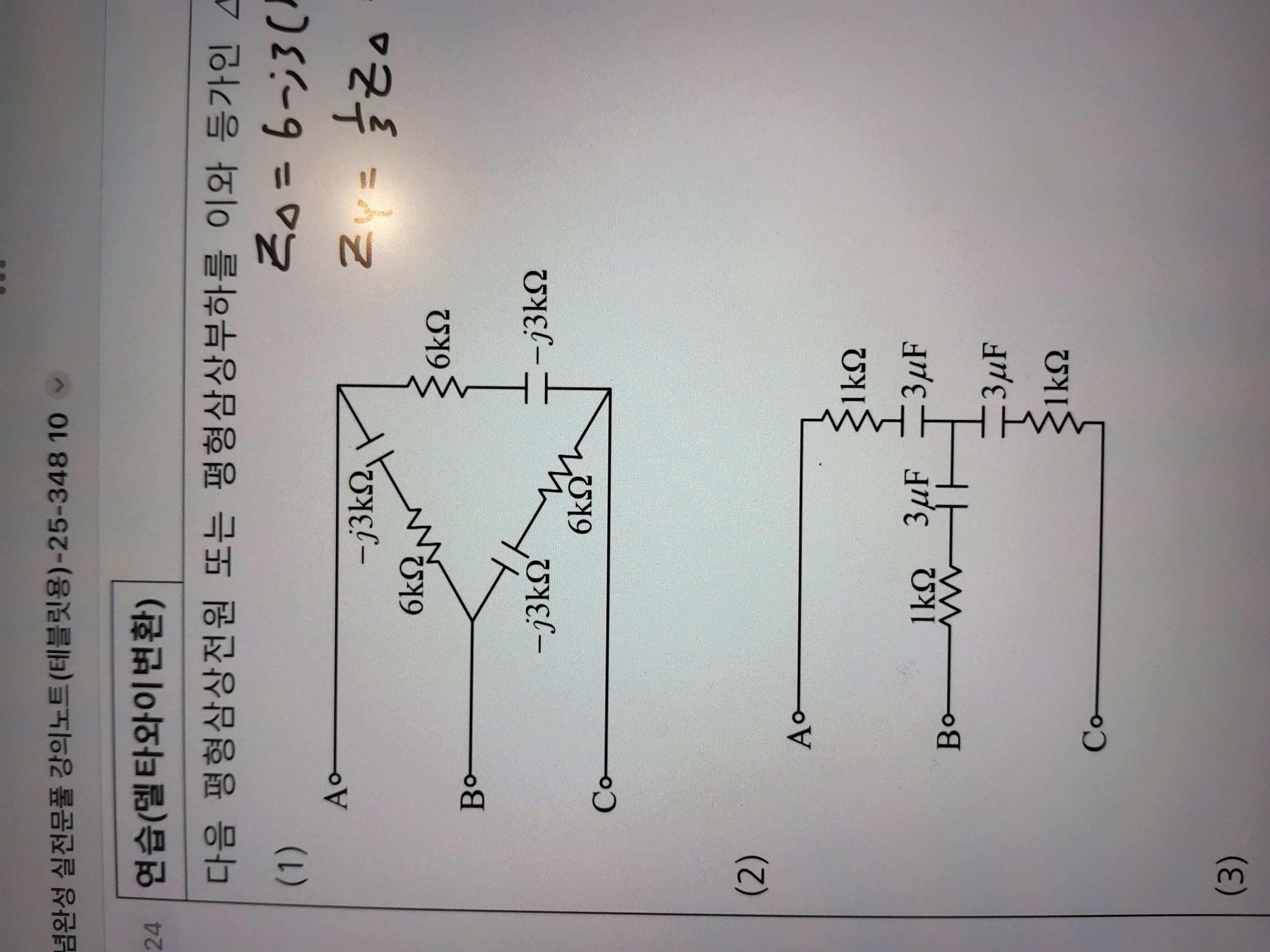 연습(델타와이변환)에서 첫번째 문제에도 커페시터가 그려져있긴한데 2번문제와 달리 단위가 옴이더라고요. 그래서 일반적인 임피던스라고 생각하고 델타를 와이로 바꿀때 각소자에서 3을 곱했다라고 보면 될까요? 2번문제는 단위가 페럿이니까 커페시터로 생각해서 3을 곱하구요?