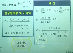 1. 33강 39분쯤 강의를 보면 검정통계량 계산식에서 분자에 p1^-p2^-(p1-p2) 로 나와있는데