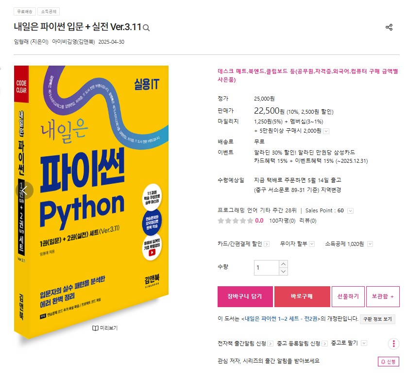 현재 강의 교재로 소개되어있는 '교재이름(내일은 파이썬)'을 검색하였더니 앞표지 디자인이 다른 책이 나왔습니다. (그리고 가격도 조금 다릅니다)