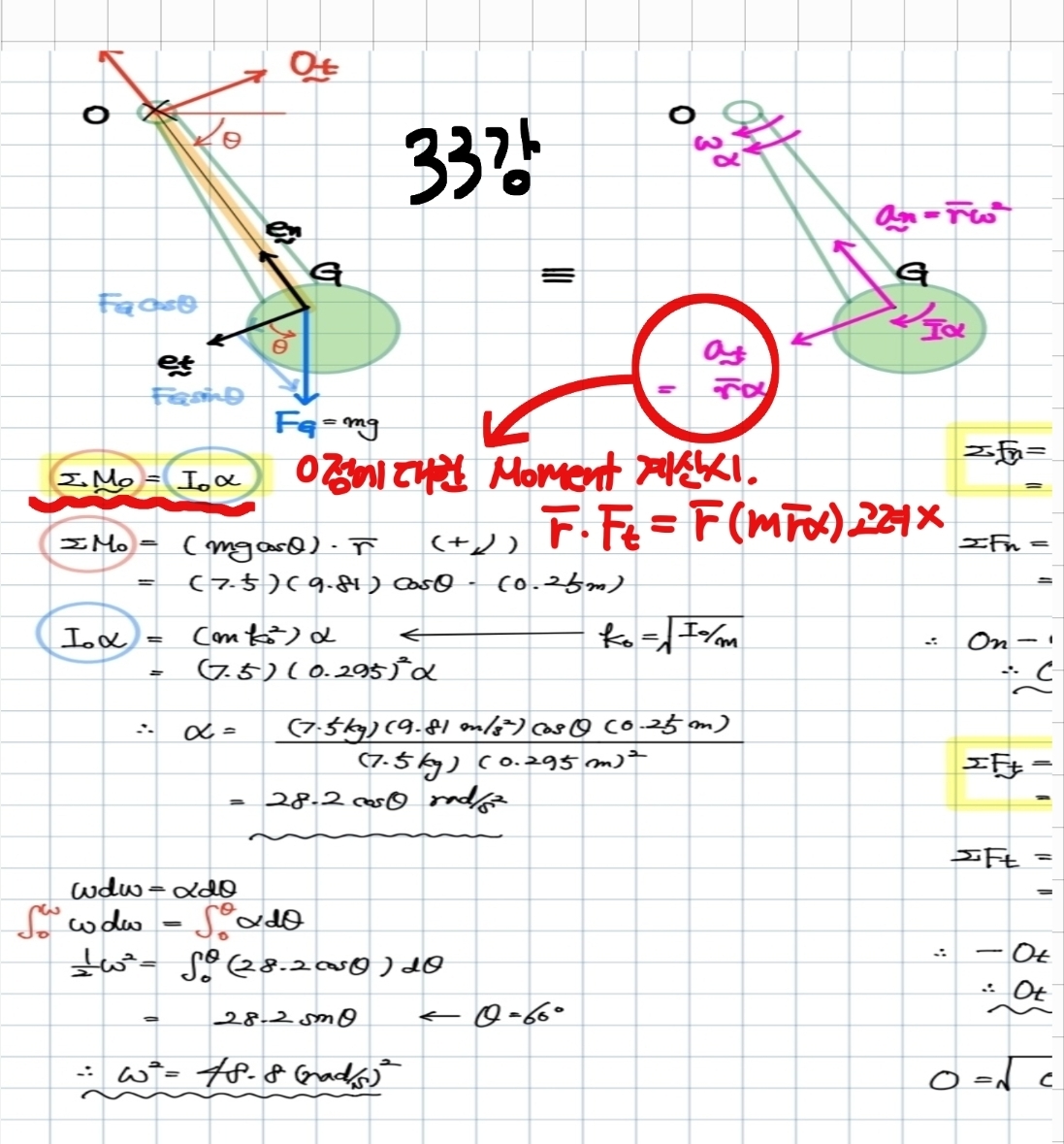 https://www.unistudy.co.kr/board/teacherQna/detail/10785?searchType%3Dtitle%26searchWord%3D34%EA%B0%95%26category%3D%26isMine%3D%26isMineReply%3D 추가) 혼자서 고민을 해보았는데 33강의 문제의 경우 물체의 2차관성모센트를 o에 대한 정보를 이용하였고, 34강 문제의 경우 o에 대한 2차관성모멘트를 사용하지 않고 G에 대한 2차관성모멘트를 사용하였으므로, 앞서의 강의 내용에 따라 o로부터 떨어진 거리에 있는 수직성분의 힘을 고려해 주었기 때문인 것일까요? 그렇다면 33강의 경우처럼 kinemetics를 이용한 O에 대한 모멘트 계산 시, G에서 작용하는 n축 방향으로의 가속도의 영향으로 발생하는 모멘트도 Ia (물체의 O에 대한 2차관성모멘트x각가속도)에 모두 포함되어 나타난다는 의미인가요? #동역학 #33강 #34강 #moment MOE #모멘트운동방정식 #FBD #kinemetics 답변 완료된 질문과 답변은 수정 및 삭제가 불가합니다. |