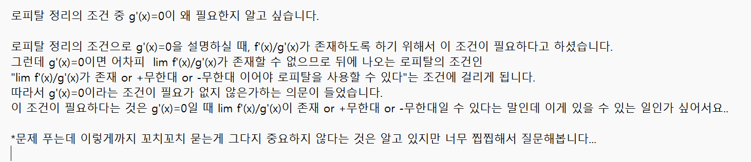 | 제목 | 답변완료 40강 12분 43초/ 로피탈정리의 사용조건 | ||