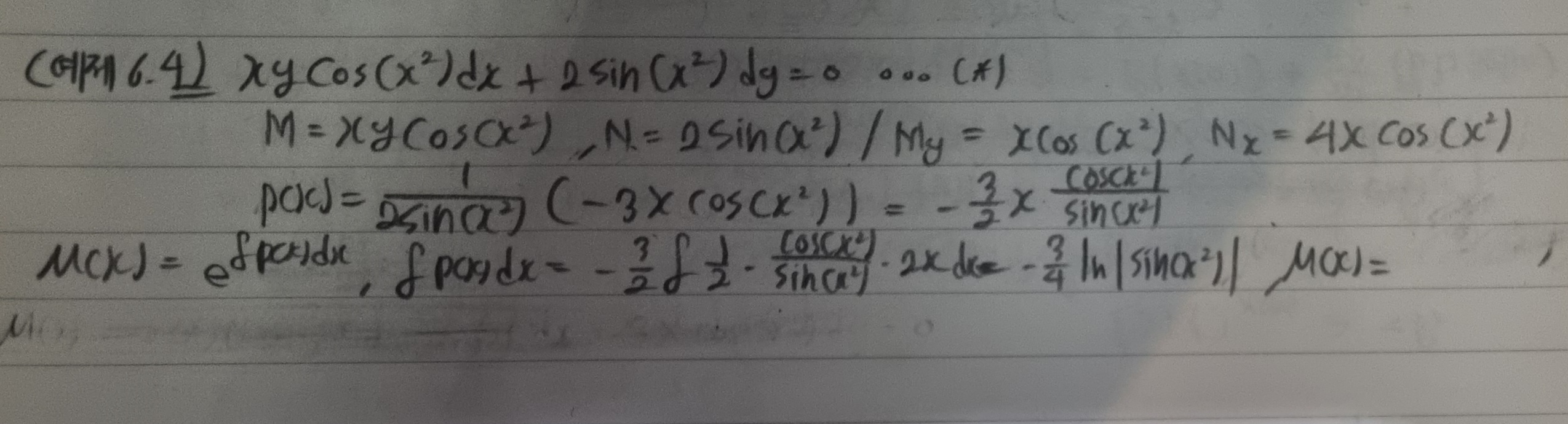 적분인자를 구해서 완전 미분방정식을 만들어 보려고 하니 식이 거창해져서 풀 엄두가 안납니다. 엄두가 안난다고 표현하긴 했지만, 정확히는 적분인자를 곱해준 식을 보았을때 식이 매우 복잡해서 적분인자를 잘못 구했나? 싶은데 적분인자를 구하는 과정에서는 잘못된 점이 없는것 같아서 혼란스럽습니다.