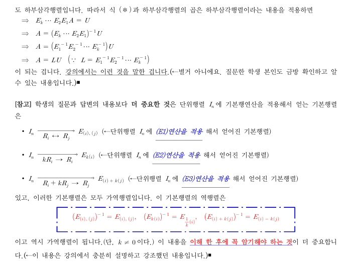 강의 19강 14분 즈음에 행교환이 일어나지 않은 기본 행연산이 적용된 기본 행렬과 그 역행렬들은 항상 하부삼각행렬이라고 말씀하셨는데