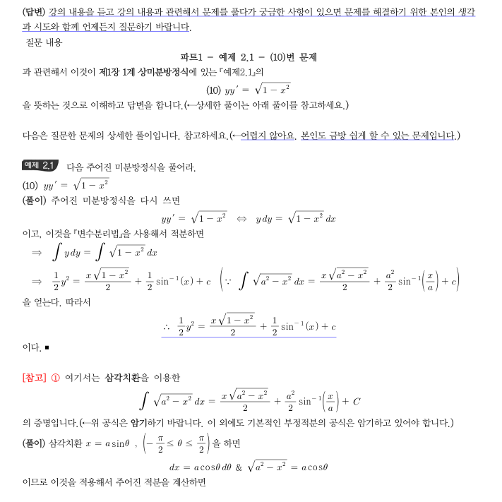 안녕하세요 교수님. 저 공학수학 수강생인데 다름이아니라 풀어주시지 않은 예제중에 못풀겠는게 나와서요. 파트1 - 예제 2.1 - (10)번 문제 풀이좀 알려주실 수 있을까요? 답변 완료된 질문과 답변은 수정 및 삭제가 불가합니다. |