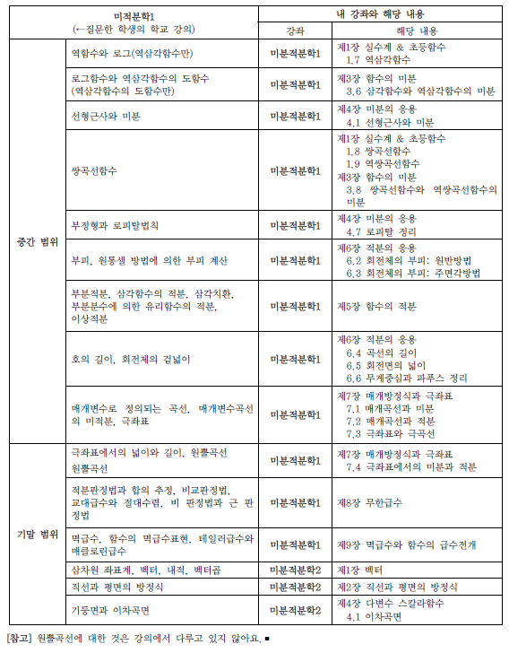 안녕하세요, 교수님 이번 학기 저의 학교의 미적분학1 과정이 다음과 같습니다. (중간) 역함수와 로그(역삼각함수만), 로그함수와 역삼각함수의 도함수(역삼각함수의 도함수만), 선형 근사와 미분, 쌍곡선함수, 부정형과 로피탈 법칙, 부피, 원통셸 방법에 의한 부피 계산, 부분적분, 삼각함수의 적분, 삼각치환, 부분분수에 의한 유리함수의 적분, 이상적분, 호의 길이, 회전체의 겉넓이, 매개변수로 정의되는 곡선, 매개변수곡선의 미적분, 극좌표 (기말) 극좌표에서의 넓이와 길이, 원뿔곡선, 적분판정법과 합의 추정, 비교판정법, 교대급수와 절대수렴, 비 판정법과 근 판정법, 멱급수, 함수의 멱급수 표현, 테일러 급수와 매클로린 급수, 삼차원 좌표계, 벡터, 내적, 벡터곱, 직선과 평면의 방정식, 기둥면과 이차곡면