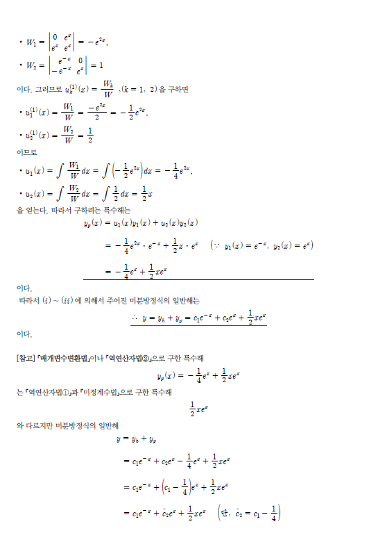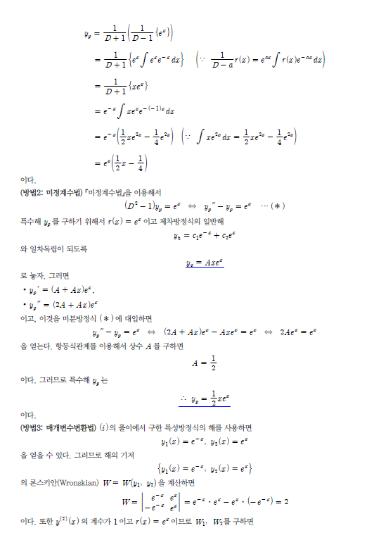 사진에 제 풀이를 첨부해 놓았습니다. 특별히 틀린 부분이 없어보여서 어디서 잘못되었는지 모르겠습니다. 공식도 적절하게 활용한 것 같습니다. 비제차항이 e^x일때 사용하는 공식이 f(a)=0이 되버리는 구조여서 일반적인 비제차항 r(x)인 경우에 사용하는 공식으로 풀었습니다. 그리고 xe^x에 대해서는 비제차항이 r(x)e^x인 경우에 사용하는 공식으로 접근했습니다. (__여기서 부터는 제 풀이가 맞다고 가정하고 질문 드립니다__) 자세히 보니 y_h와 y_p가 겹치는 부분이 있습니다. 제가 구한 비제차항을 풀어보면 (-1/4)e^x는 y_h의 c_1e^x ••• (1)와 겹치게 됩니다. 이런 경우에 만약 식(1)과 합친다고 생각하고 해당 항을 지워버리면 답이 되는것이 확인됩니다. 제 풀이가 틀리지 않았다면 이렇게 생각할 수도 있는데, 앞서 배운 내용으로는 y_h와의 일차독립을 위해 y_p에 x를 적절히 곱해줘야 한다고 알고 있습니다. 그렇다면 이 특수해의 경우 x^2을 곱해줘야 하는것 아닌가요? 항상 좋은 답변 남겨주셔서 감사합니다. 답변 완료된 질문과 답변은 수정 및 삭제가 불가합니다. |