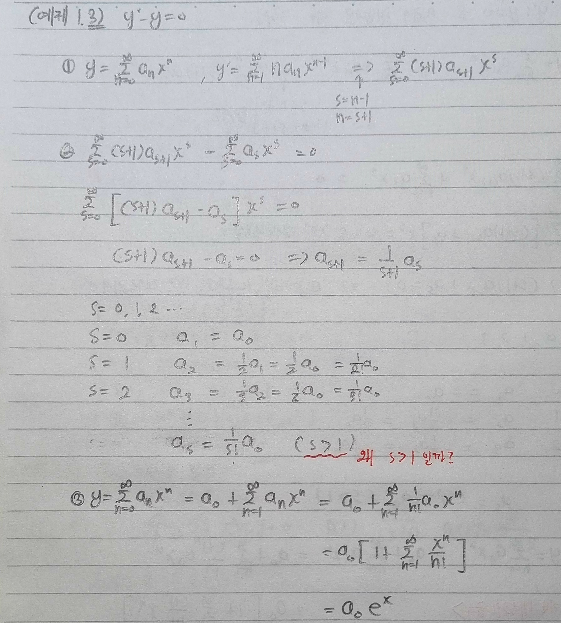 사진에서 빨간색으로 쓴 부분에 대한 질문입니다. s=0부터 대입을 했는데 일반항이 s>1에서만 해당된다는 것이 좀 어색합니다. [추가 질문] 문제 구조상 필연적으로 a_0가 앞으로 나와야 할 것 같다는 의심반 확신반이 있는데, 이 부분에 대해서도 왜 그런지 명확한 이유를 모르겠습니다. 답변 완료된 질문과 답변은 수정 및 삭제가 불가합니다. |