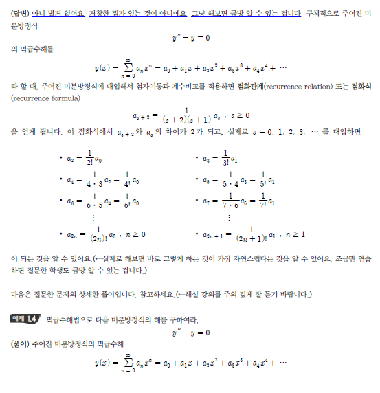 | 제목 | 답변완료 미분방정식의 급수해 - 4.1 멱급수 해법 문제풀이 (44:40 부근) | ||