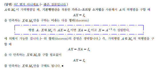 안녕하세요. 해당 강의 24분 30초 쯤에 적힌 판서와 설명에 대해 질문이 있습니다. 기본행연산을 이용하여 A의 역행렬을 풀때, 왜 AX=In 만 풀면되는것인가요? A가 가역행렬일때, 정의는 AX=XA=In 을 만족하는 X가 하나 존재하는것인데, AX=In =XA 를 푸는게 아니라 왜 AX=In 만 풀어도 되는건지 궁금합니다. 앞의 단원들에서는 역행렬이 있는 가역행렬을 보일때 AB=BA=In 모두 보였는데 현재는 하나만 보여도 되길래 차이가 무엇인지, 헷갈려서 질문드립니다. 감사합니다. 답변 완료된 질문과 답변은 수정 및 삭제가 불가합니다. |