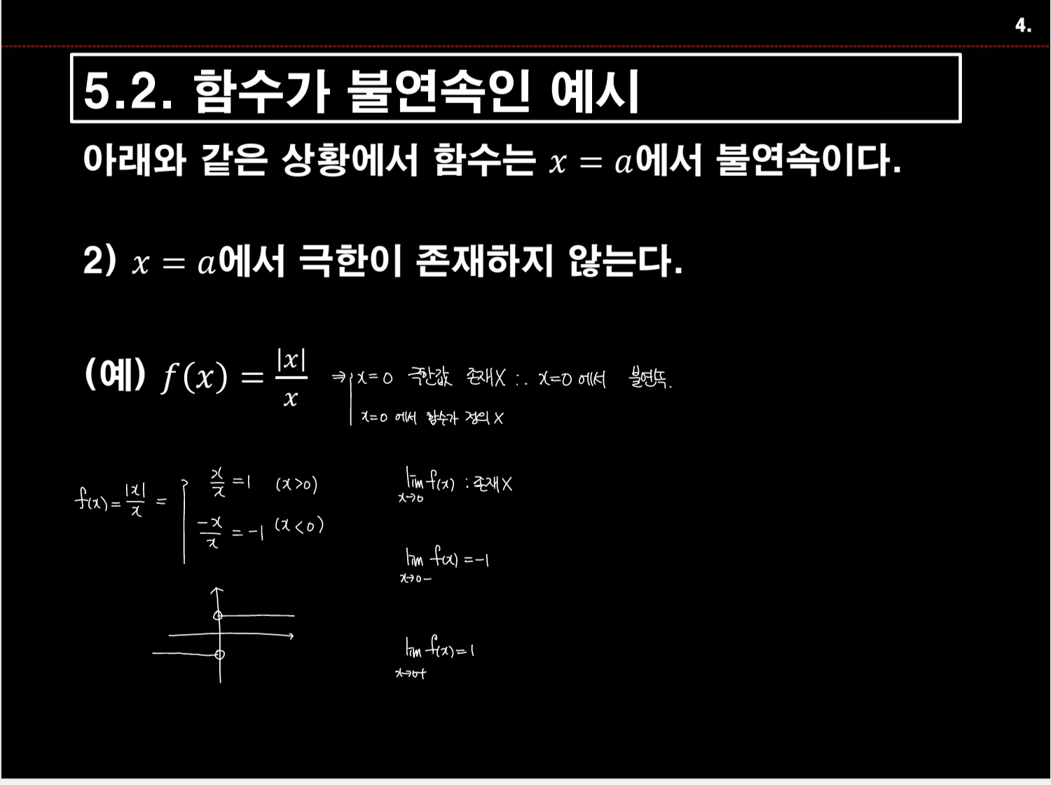 f(x)=|x|/x는 분모가 x이기에 x=0을 대입하게 되면 분모가 0이 되어서 분수가 성립할 수가 없습니다.