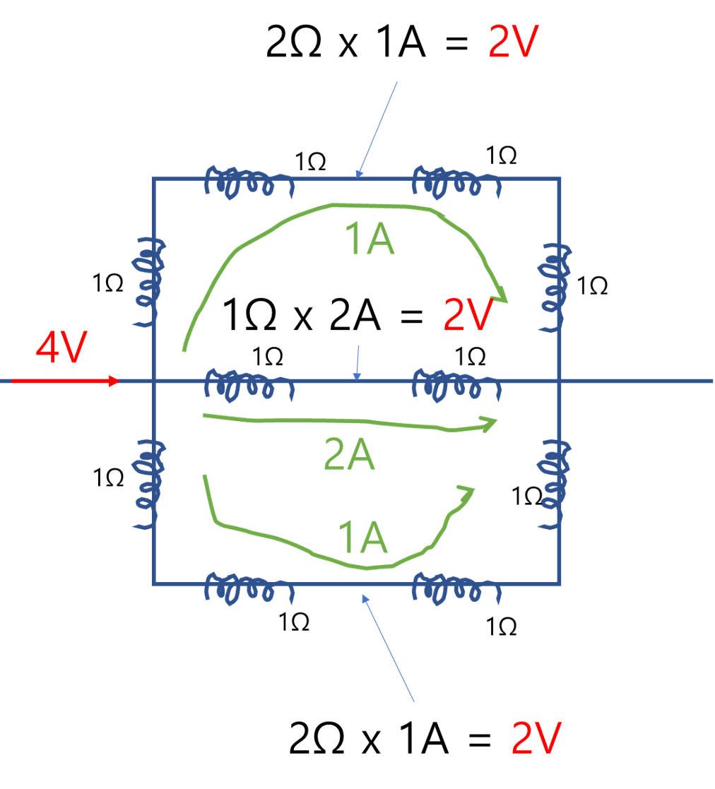 - 가운데 선이 없다고 생각하고 계산해 보면 그 점에서 전위가 같습니다. 신기하죠?