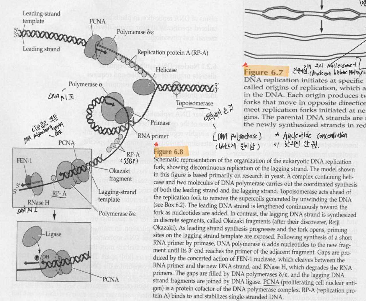 많이 기다렸을 텐데, 답이 늦었네요. 더불어 강의를 들으며 이렇게 깊이 고민하고 질문 주어서 감사합니다.사실 이 질문은 캠벨 생물학에서는 다루는 수준보다 심화된 진핵생물의 DNA 복제를 다루고 있어서 이해가 쉽지 않았을거에요.